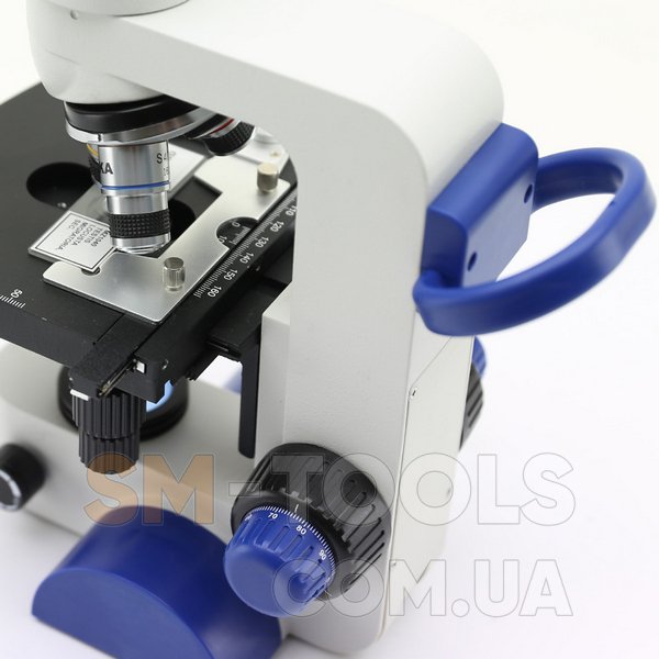 Удобство наблюдения обеспечивается наклоном бинокулярной насадки под углом 30º. Полноповоротная насадка позволяет наблюдать в микроскоп с любой удобной позиции, не меняя положения прибора в пространстве. Резкость изображения достигается с помощью коаксиальных винтов тонкой и грубой фокусировки.