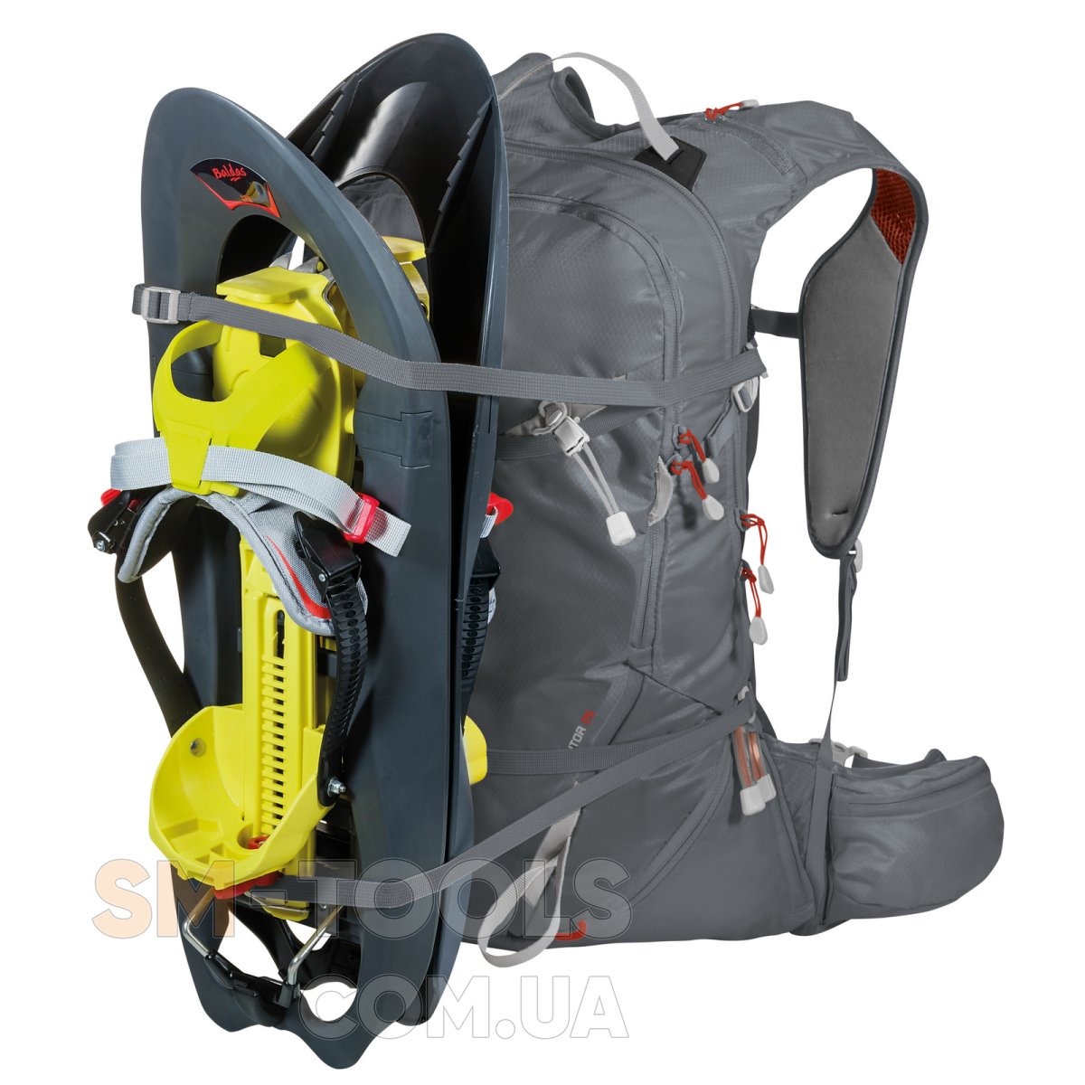 - Front Holders - Рюкзак имеет специальную фурнитуру, предназначенную для фронтального крепления лыж на фасаде по диагонали. Одно крепление находится в потайном кармане на верхней шлейке, а в качестве второго используется нижняя стропа для ледоруба и треккинговых палок, либо дополнительные стропы, поставляемые в комплекте. Такая фурнитура позволяет зафиксировать не только лыжи, но и другое объемное снаряжения, как одежда или веревка.