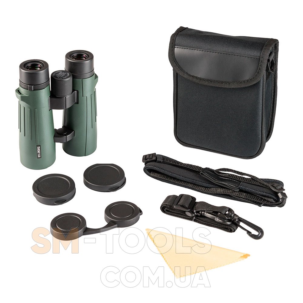 У защитных крышек для оптики предусмотрены крепления к корпусу бинокля и к нашейному ремешку, что минимизирует вероятность их потери. В комплекте с биноклем поставляется плотный тканевый чехол с возможностью ношения на поясе или плече.