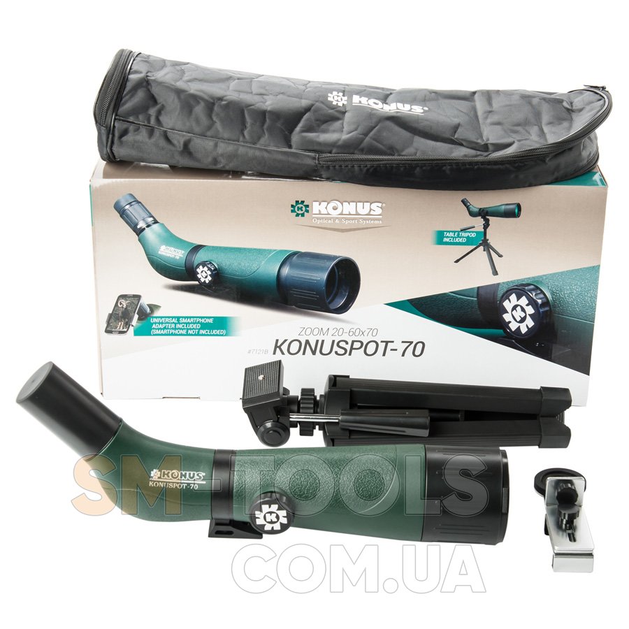 KONUSPOT-70 20-60x70 поставляется в комплекте с настольным штативом, фотоадаптером и превосходным чехлом для транспортировки.