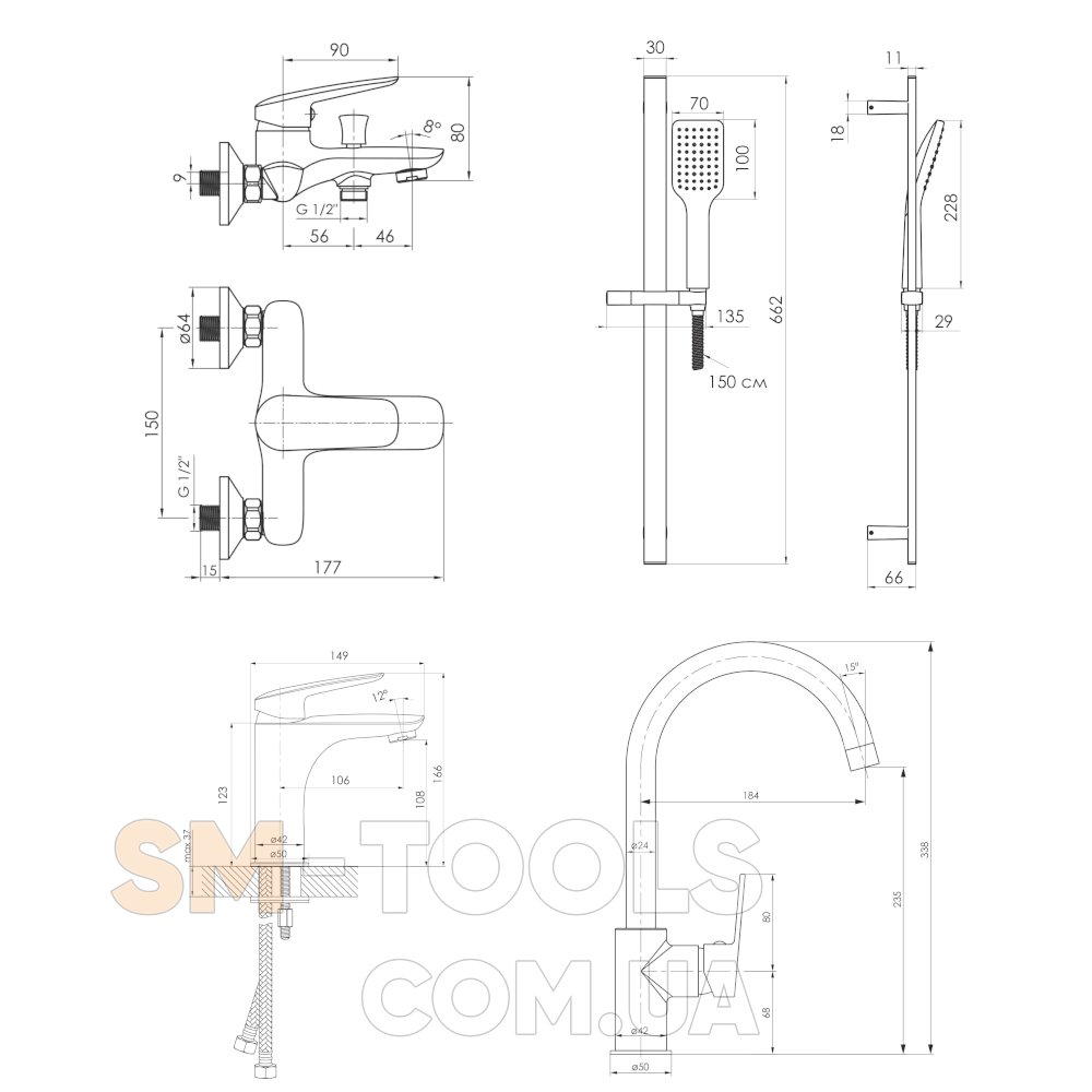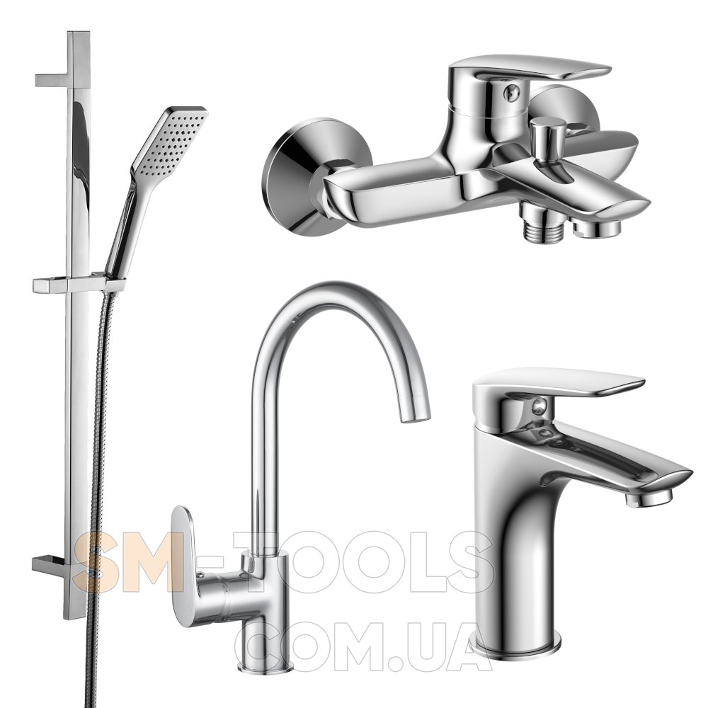- Комплект – это практично. Одна покупка позволит оборудовать смесителями всю ванную комнату и кухню