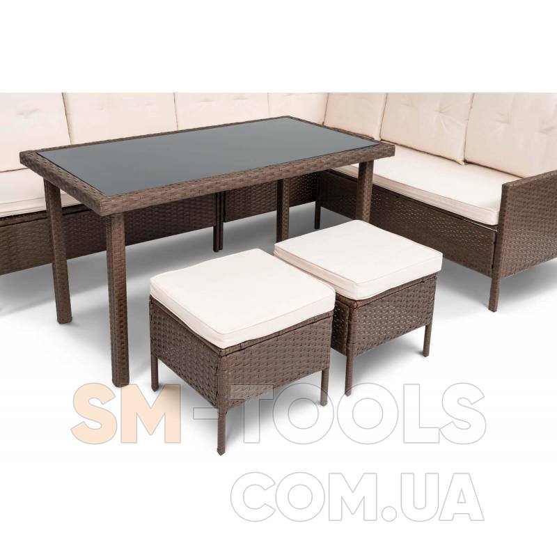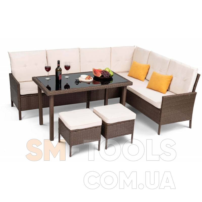 Мечтаете посетить Венецию, но пока что не можете? Не беда, очаровательная садовая мебель VENICE из ротанга станет отличным воплощением вашей сокровенной мечты. Утонченный дизайн, четкие линии, универсальная расцветка, приятные на ощупь поверхности, прочные материалы, искусное плетение из ротанга — в эту мебель невозможно не влюбиться с первого взгляда. Изысканный набор покоряет своей невероятной эстетикой, великолепным исполнением и надежной практичностью. С ним даже самый обыденный вечер превратится в захватывающее путешествие по Италии, а шумные посиделки — в элегантный отдых с европейским привкусом. Купить садовую мебель VENICE — значит не только подарить себе и своим близким прекрасную возможность ощутить дух культового города, но и стать владельцем по-настоящему функциональной красоты. Комплект является отличным продуктом итальянской марки di Volio, чье имя само по себе олицетворяет гарантию качества по весьма приятной цене. Собираясь заказать садовую мебель из ротанга от di Volio, будьте уверены в ее надежности и долговечности, ведь фирма-производитель предоставляет гарантию на целых 24 месяца. Комплект Venice состоит из роскошного углового дивана, двух мягчайших пуфов, крупного стола со стеклянным верхом, подушек со съемными чехлами и креплений для самостоятельной сборки.