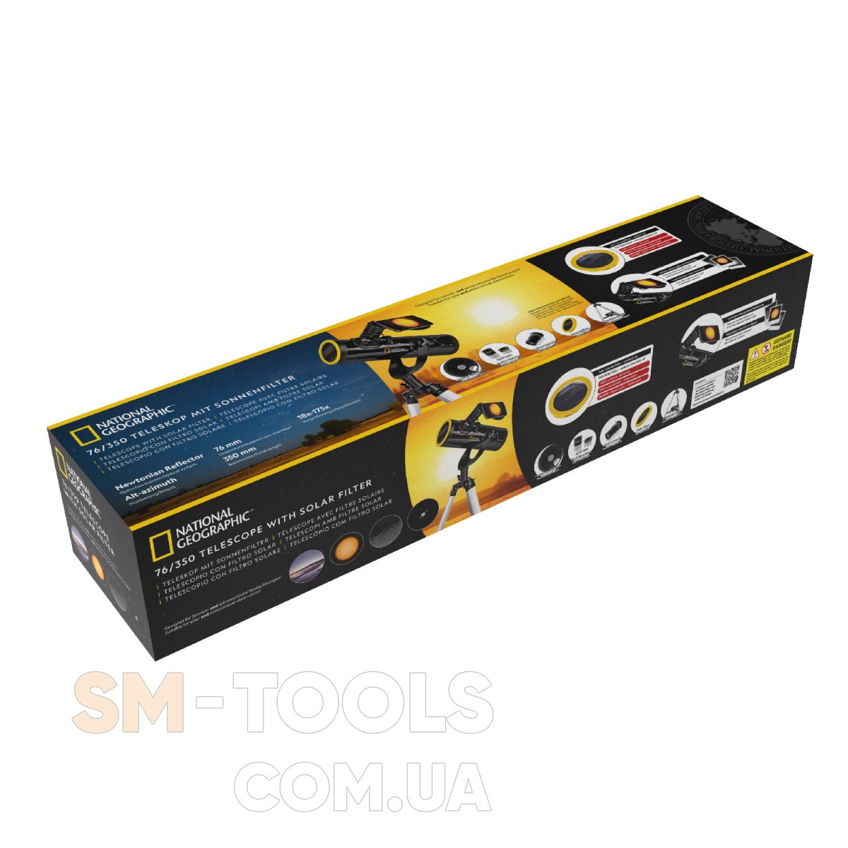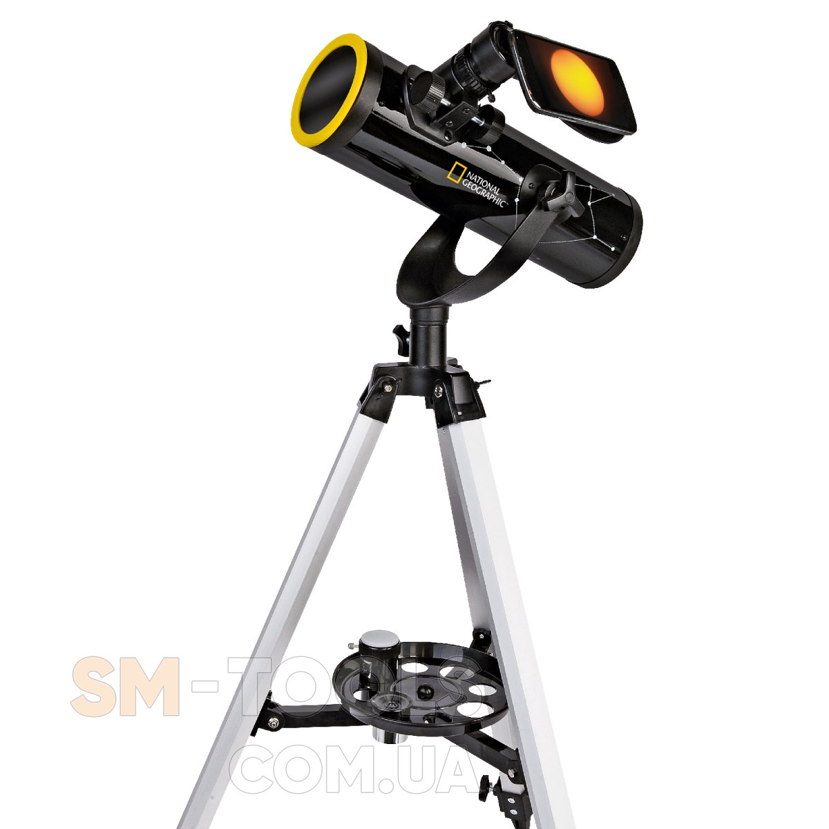 National Geographic 76/350 AZ Solar - универсальный зеркальный телескоп по доступной цене. Не смотря на то что телескоп рекомендован для начинающих астрономов, это отнюдь не игрушка. 76-мм зеркальный объектив, позволяет наблюдать лишенное хроматической аберрации, достаточно контрастное изображение ночного неба. А высокий показатель светосилы обеспечит видимость планет и звезд более слабого свечения. Вы сможете различать более чёткие контуры кратеров на Луне диаметром 8 км, звёзды слабого свечения (до 11,5 звездных величин), Сатурн, Уран и Нептун в виде звезд, полярные шапки Марса. Туманности вокруг созвездий Лира и Орион, находящиеся на расстоянии до 4000 световых лет от Земли станут доступны Вашему глазу в виде светлых достаточно контрастных пятен.