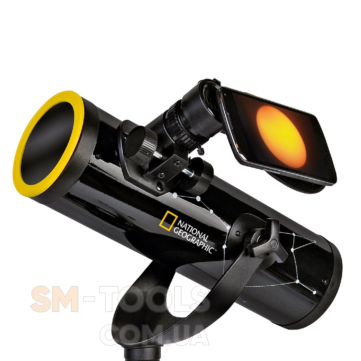 Универсальный и уникальный в своем роде телескоп National Geographic 76/350 AZ Solar ломает стереотип того, что захватывающие наблюдения в телескоп можно проводить только ночью. Теперь наблюдения за солнечной активностью, дневные ландшафтные наблюдения и ночные наблюдения звездного неба можно проводить с помощью одного телескопа National Geographic 76/350 AZ Solar. Важным моментом является наличие сертифицированного солнечного фильтра, позволяющего безопасно для глаз наблюдать за Солнцем. Дневные и ночные наблюдения можно заснять на камеру смартфона, для чего в комплекте с телескопом поставляется специальный адаптер. Данная модель имеет большую вариативность увеличений благодаря наличию линзы Барлоу в базовой комплектации.