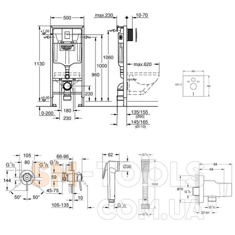 Характеристики Комплект Grohe инсталляция Rapid SL 38772001 + набор для гигиенического душа со смесителем BauClassic 111048: