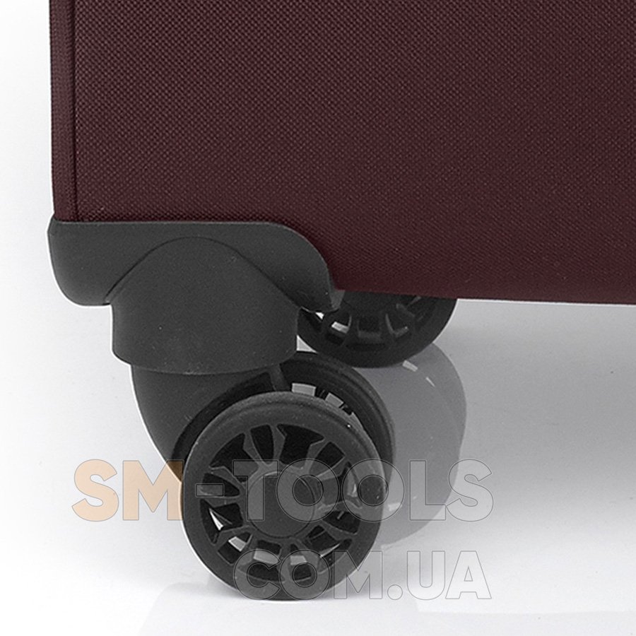 Чемодан оснащен четырьмя полноповоротными, спаренными колесами с возможностью независимого разворота каждого колеса на 360°. Системой предусмотрено равномерное перераспределения нагрузки на каждое колесо, что в свою очередь способствует плавному качению и маневренности чемодана, прилагая при этом минимум усилий. Колеса изготовлены из высокотемпературного термопластичного полиуретана (TPU). Материал обладает прочностью сравнимой с пластиком, гибкостью силикона, а так же имеет повышенную устойчивость к перепадам температур. Отличительной особенностью колес из TPU материала является снижение шума до минимума при качении чемодана по неровной поверхности. Благодаря устойчивости к истиранию материал колес отличается длительным сроком эксплуатации.