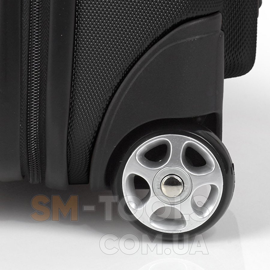 Чемодан оснащен парой надежных колес которые изготовлены из высокотемпературного термопластичного полиуретана (TPU). Материал обладает прочностью сравнимой с пластиком, гибкостью силикона, а так же имеет повышенную устойчивость к перепадам температур. Отличительной особенностью колес из TPU материала является снижение шума до минимума при качении чемодана по неровной поверхности. Благодаря устойчивости к истиранию материал колес отличается длительным сроком эксплуатации.