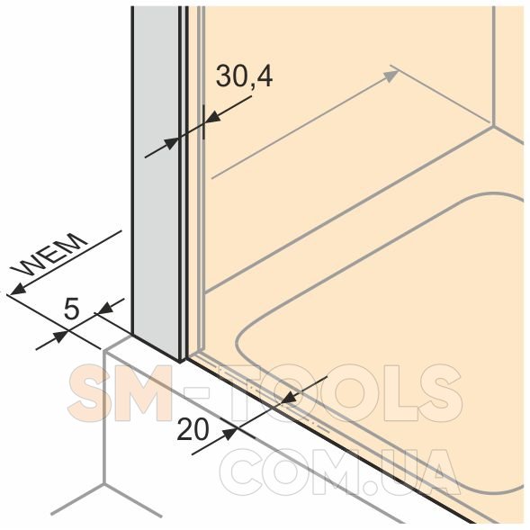 Диапазон регулирования раздвижной двери для компенсации неровностей стен ниша -30/+20 мм, боковая стенка -15/+30 мм