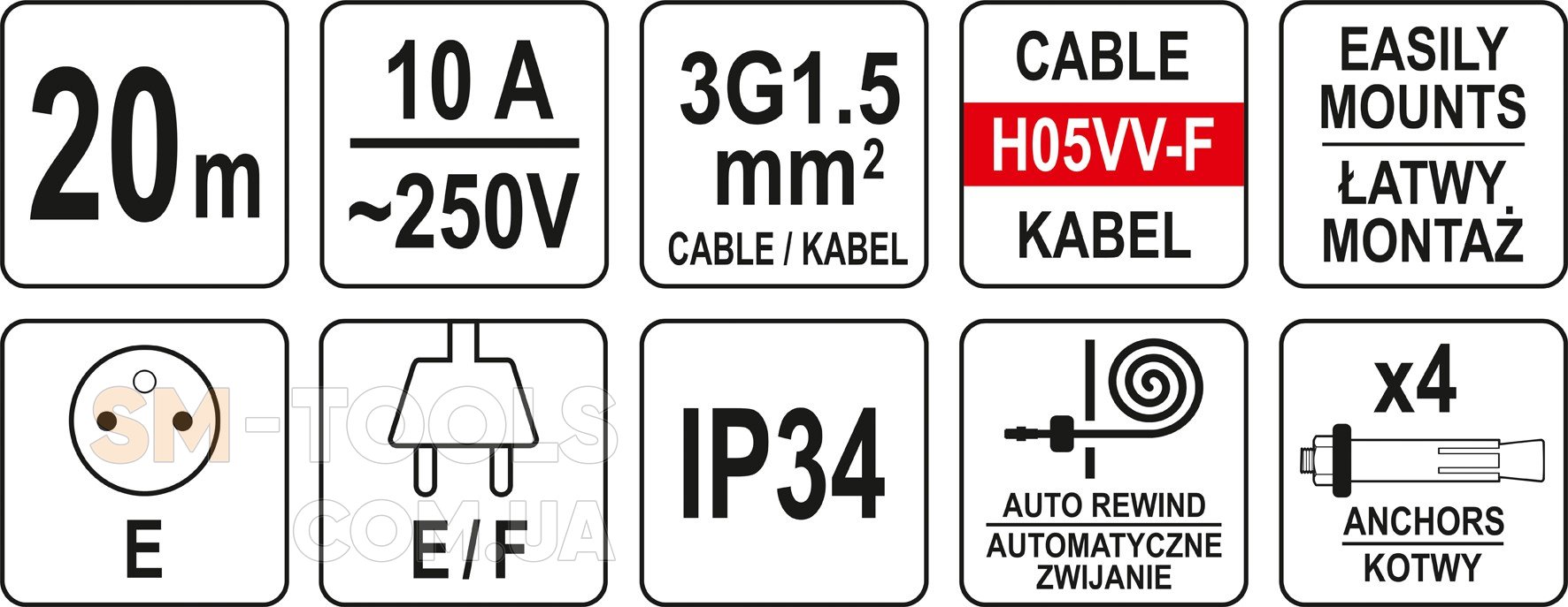 Поставляется в корпусе с автоматической котушкой, которая обеспечивает хорошую защиту проводов и удобство использования