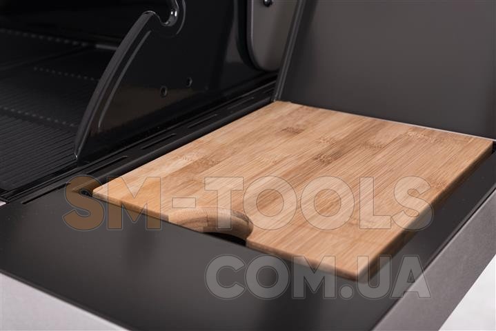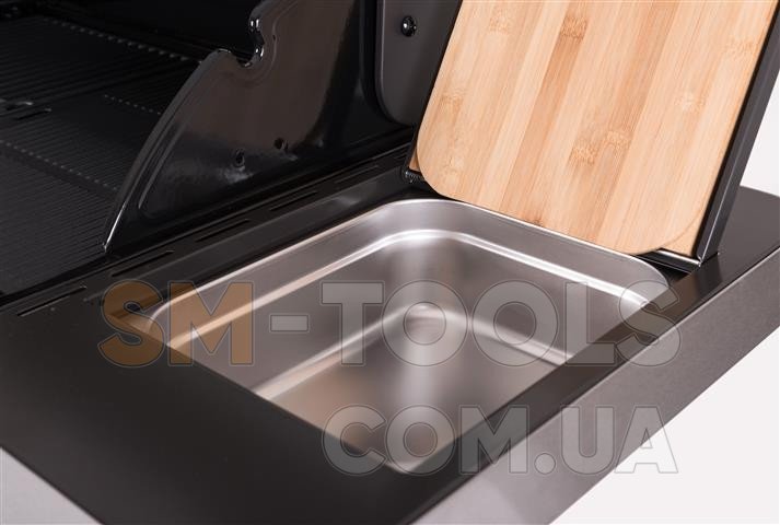 З правого боку гриль має знімну дошку для нарізання і тримач з нержавіючої сталі для інгредієнтів чи відходів. З лівого боку знаходиться додатковий боковий пальник, який розширює можливості приготування страв. У термокамері є місце для збереження страв у гарячому вигляді.