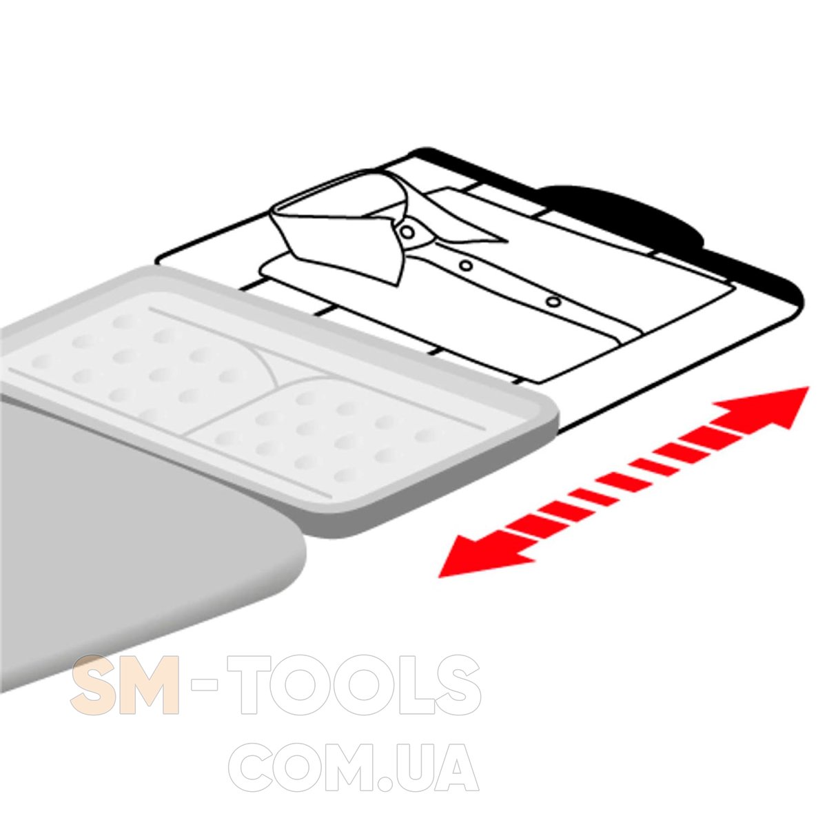 Гладильная поверхность доски имеет сквозную перфорацию по типу сетки. Благодаря такой конструкции, пар из-под утюга проходит сквозь саму доску, тем самым предотвращается скапливание конденсата под чехлом. Закругленное окончание доски позволяет выгладить труднодоступные места в рубашках или блузах. Чехол съемный, по мере использования его всегда можно постирать или заменить на новый. Гладильная доска плавно и без особого усилия регулируется по высоте для максимально комфортного использования. На основания ножек одеты колпачки, предохраняющие доску от скольжения.