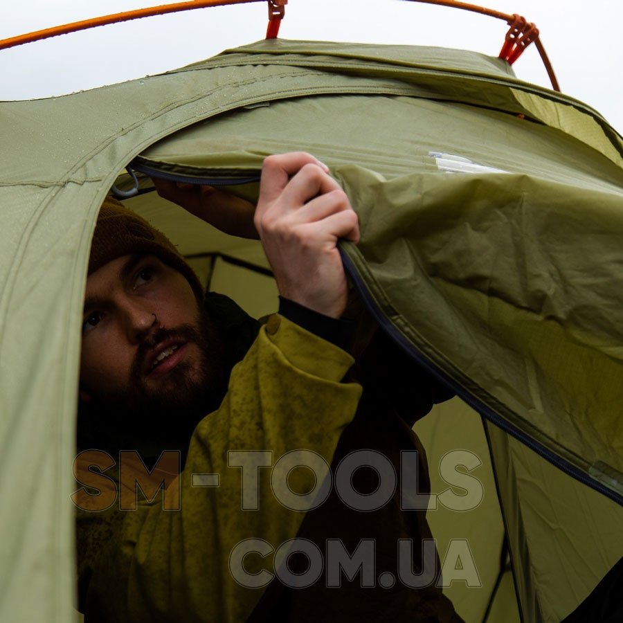- Конструкция тента предусматривает по два отдельных входа-доступа к каждой двери внутренней палатки. Это весьма удобно как с точки зрения доступа к вещам в тамбурах, так и с точки зрения открытия / закрытия определенных входов для улучшения вентиляции или увеличения сопротивления ветровым нагрузкам. При этом двери тамбура могут быть полностью свернуты и закреплены сверху, открывая полный доступ к дверям внутренней палатки.