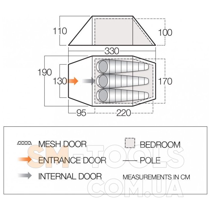 Внешняя палатка (ДхШхВ), мм: 3300 х 1900 х 1100