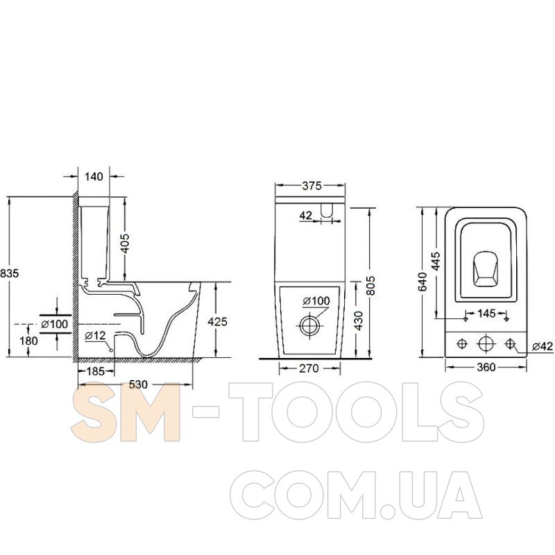 Габариты изделия (ВхШ), мм - Унитаз: 835х365х640. Сиденье 45х348х450. Бачок: 405х375х140.