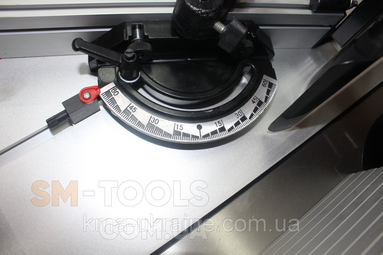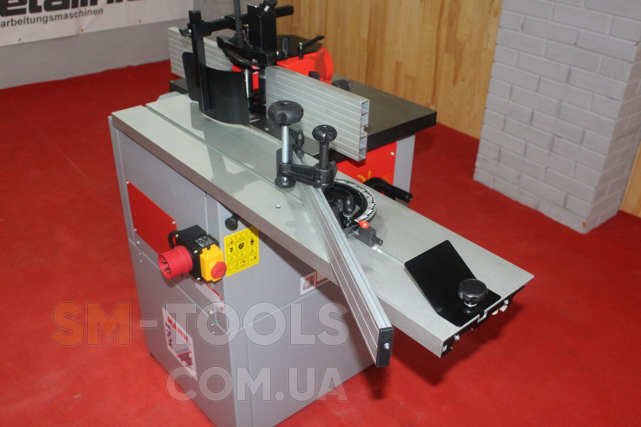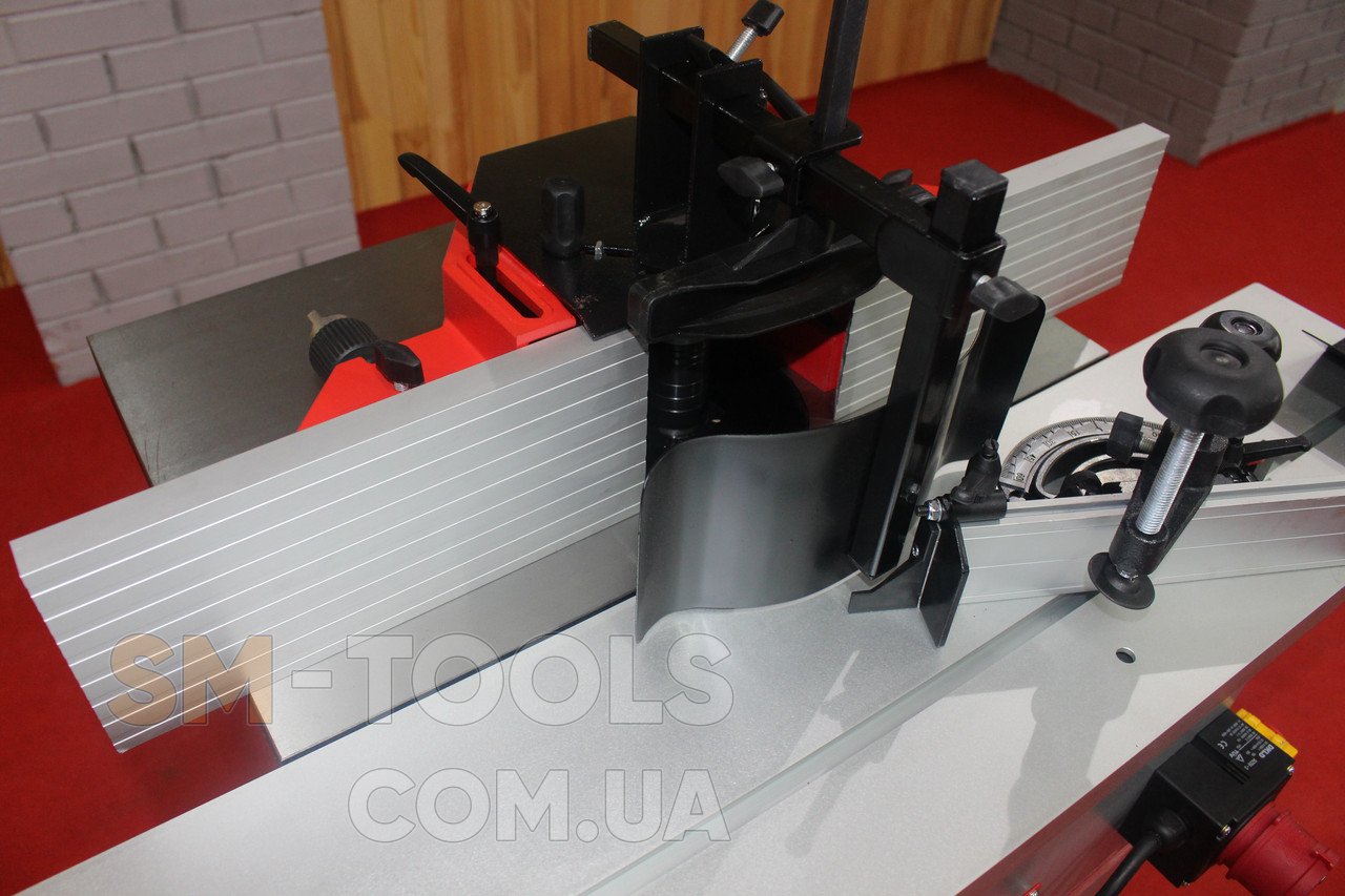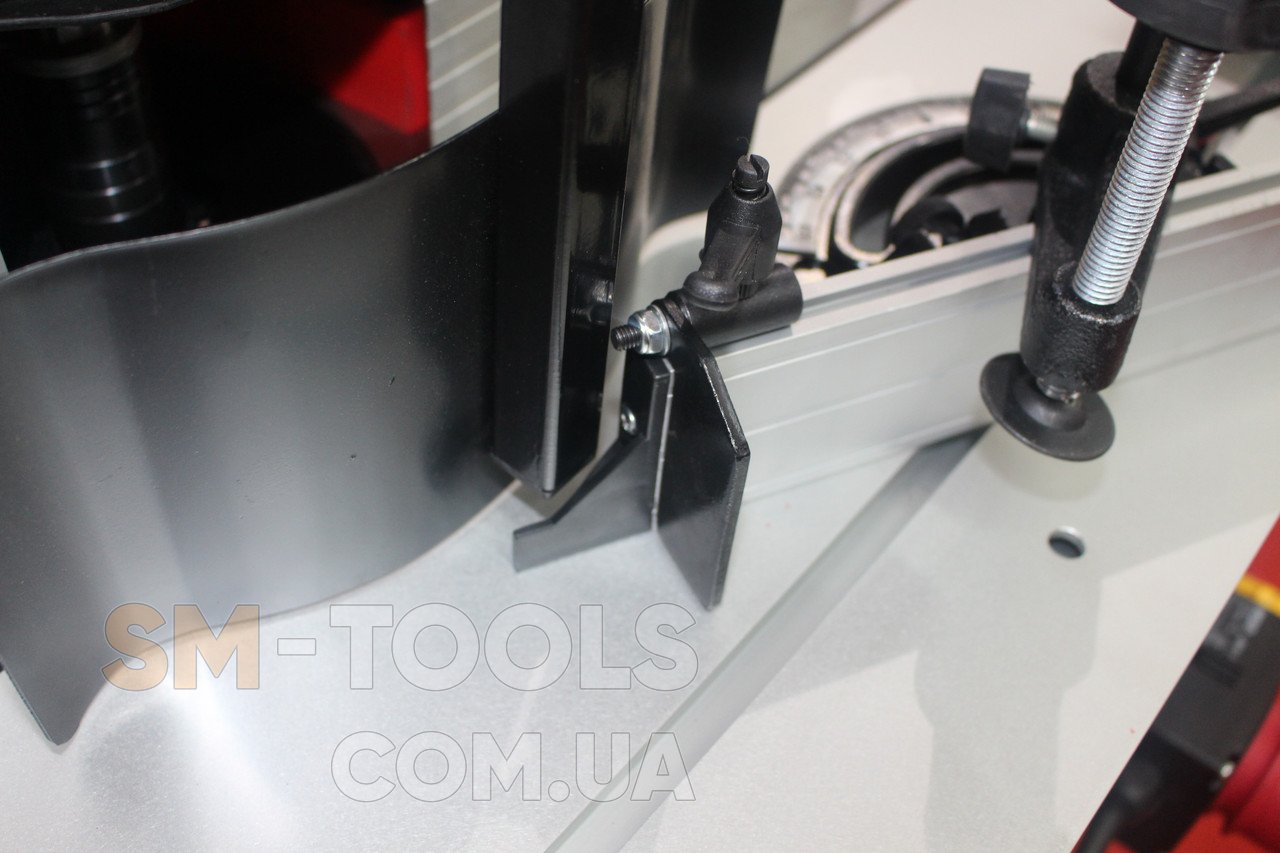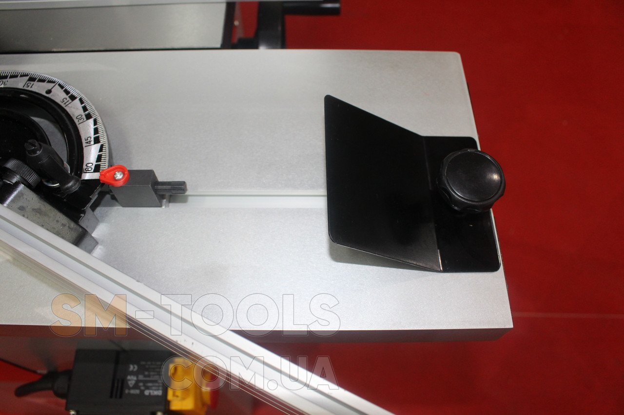 Движимая каретка изготовлена из анодированного алюминия позволяет использовать фрезерный станок как шипорез, плюс дополнительный упор который может устанавливается под углом (0-60°) так же каретка оснащена ручным прижимом который жёстко фиксирует заготовку на каретке.