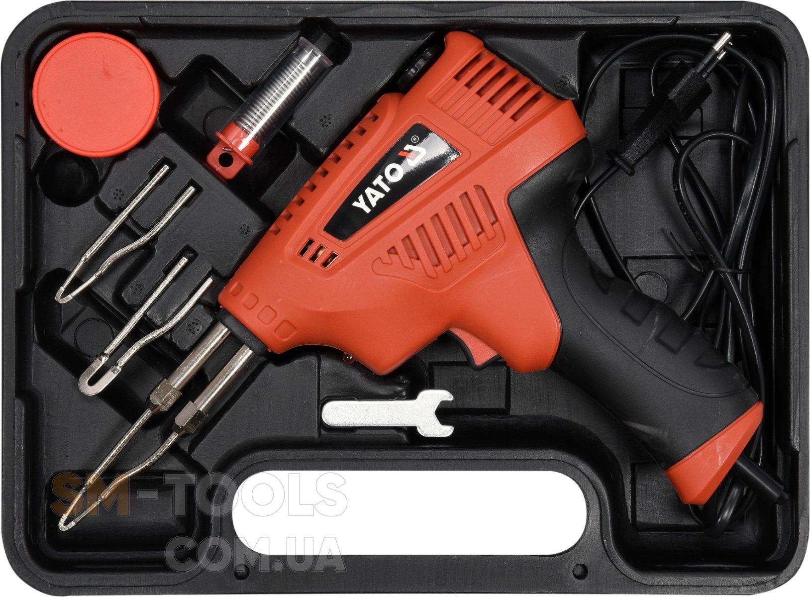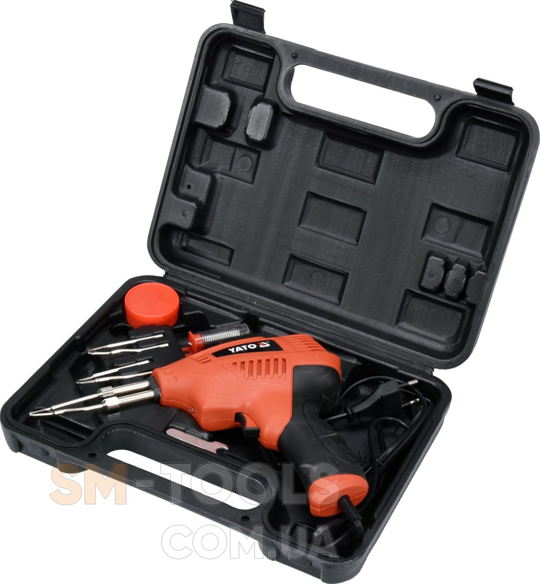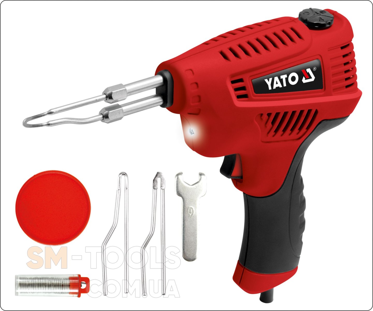 Импульсный паяльник YATO YT-82451 предназначен для монтажа или демонтажа элементов, узлов электронных и электротехнических изделий. Благодаря высокой мощности (200 Вт), паяльник быстро нагревается и готов к работе. Нагревательным элементом выступает сменное стальное жало, на которое подается ток. Для удобства при использовании паяльник оснащен светодиодной подсветкой. Регулировка температуры позволяет оптимально ее подобрать для соединяемых материалов.