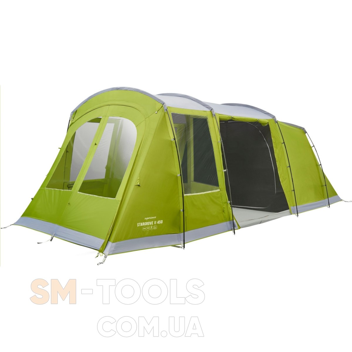 Новинка 2020 года от Vango! Четырехместная туннельная палатка Vango Stargrove II 400 - палатка для семьи с большой площадью жилого пространства и панорамными окнами, обеспечивающими превосходый обзор пейзажей. Просторная двойная гостиная с интегрированной стенкой создает уют, способствующий общению и релаксу внутри палатки даже при неблагоприятных погодных условиях. Широкий вход в гостиную оборудован москитной сеткой и обеспечивает постоянный приток свежего воздуха в палатку, а наличие тканевых роллетов на окнах решает вопрос уединения. Затемненная спальная зона Nightfall Bedrooms трансформируется в два просторных отсека с индивидуальным размером спального места 70 см и подарит возможность крепкого сна во время утреннего солнца. Каркас палатки состоит из четырех дуг Powerflex® для устойчивости при сильном боковом ветре, а вместе с запатентованной системой TBS®II обеспечивает жесткость и надежность всей конструкции палатки. Внешний тент изготовлен из ткани Sentinel Active, которая разработана для обеспечения отличного качества и минимального веса. В ткань вплетена полиэфирная нить, которая на 97% защищает внутреннее пространство от УФ-лучей солнца. Кроме того, палатка имеет достаточно высокий уровень водозащиты. Данная модель палатки прошла испытания на безопасность согласно Международного стандарта ISO5912.