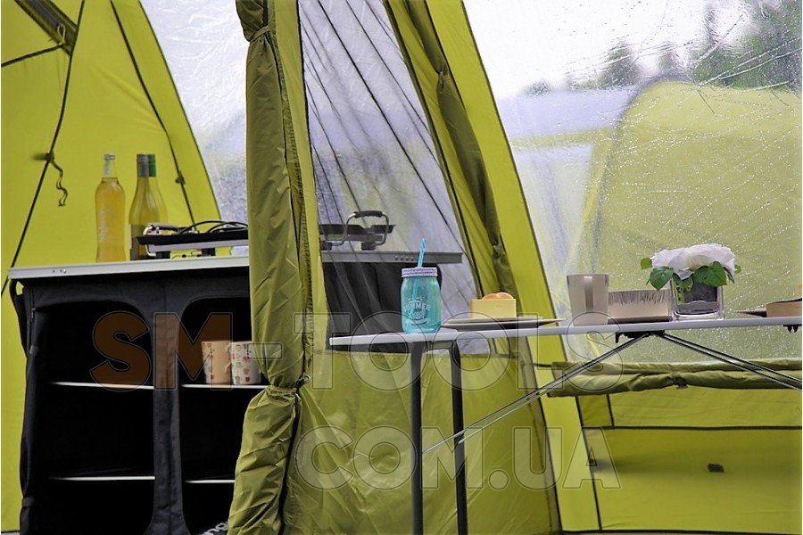 - Встроенные люверсы позволяют использовать специальные телескопические стойки King Poles (не поставляются в комплекте) в виде опор для создания навеса от солнца над входом.