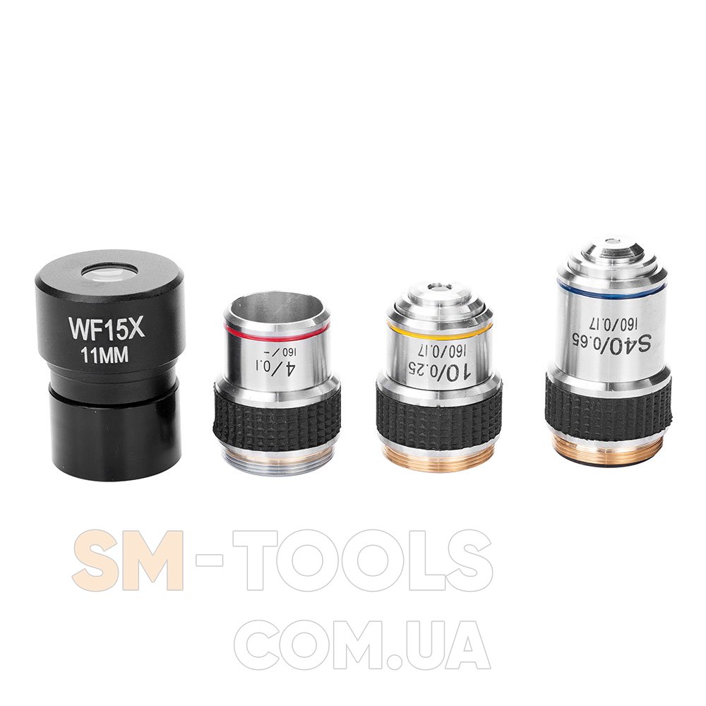 - Ахроматические объективы, двойная регулировка фокуса (грубая и точная), диафрагма, противопыльный чехол, адаптирован для фотографирования. Окуляр WF15X . Три взаимозаменяемых ахроматических объектива: 4X, 10X, 40X .