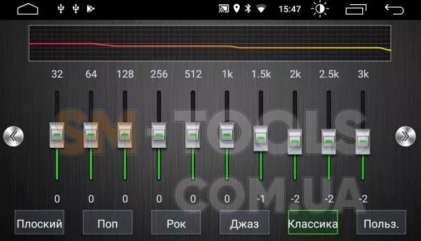 Чем шире диапазон настроек эквалайзера, тем точнее настройки частотной характеристики системы. Прежде, пользователи довольствовались всего двумя настройками темброблока: Bass и Treble (Бас и Высокие). Встроенный в DSP эквалайзер, позволяет управлять звучанием системы в зависимости от ваших потребностей и предпочтений. Настройка осуществляется уменьшением или увеличением громкости каждой из тридцати частотных полос (эквалайзер располагается на трех экранах устройства). Если Вы не хотите вникать в детали, то можете воспользоваться одним из имеющихся режимов предустановок: Рок, Поп, Джаз, Классика, Плоский или Пользователь. В режиме «Пользователь» можно сохранить индивидуальную схему настроек эквалайзера.