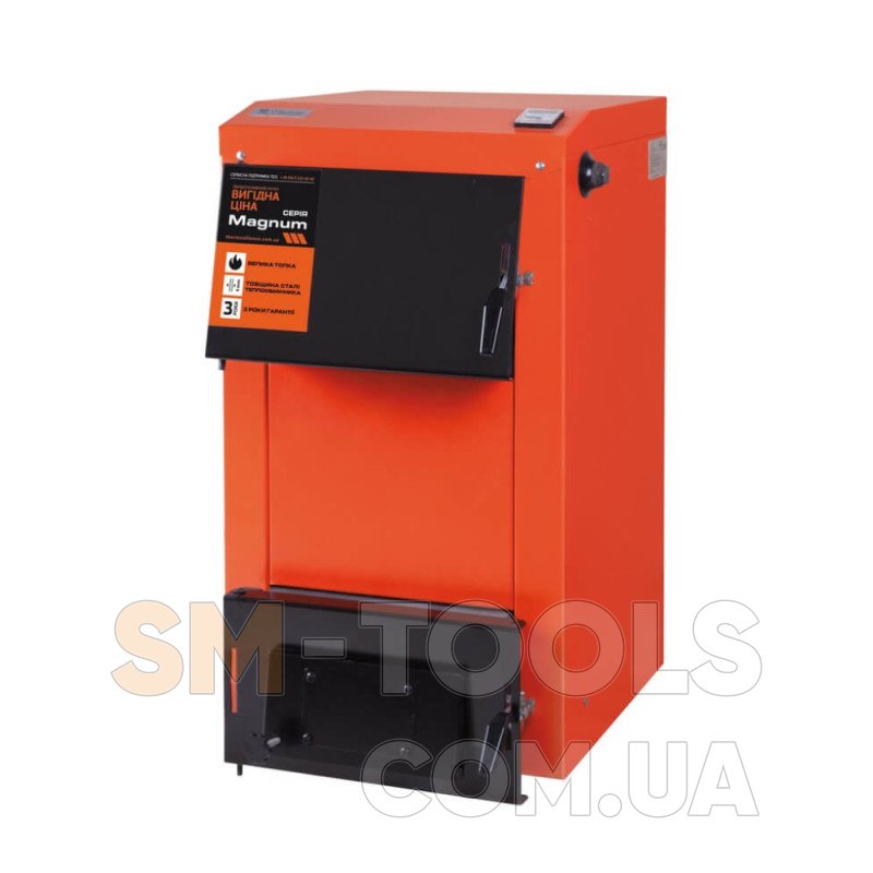 Серия Magnum SFW имеет простую и надежную конструкцию. Дверки котла имеют возможность установки как на правую, так и на левую сторону, что позволяет использовать котел практически в любом помещении. На боковых стенках установлены порты под механический регулятор тяги, который служит для автоматизации управления режимами работы котла. На нижней двери предусмотрен люк для подключения вентилятора, т.е. есть возможность управлять режимами работы котла в полностью автоматическом режиме. С тыльной стороны котла предусмотрен порт под ТЭН. Под чугунными колосниковыми решетками смонтированы водонаполненные трубы, которые увеличивают площадь теплообмена в результате чего повышается КПД котла на 2-3%, что влечет за собой снижение затрат на топливо.