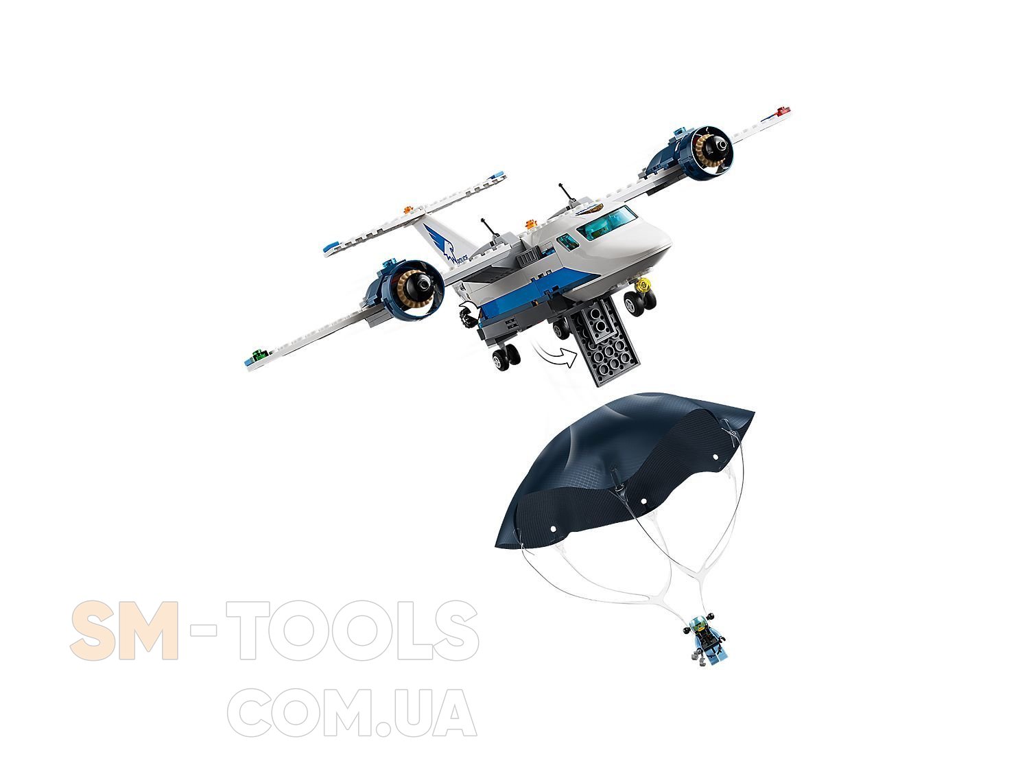 Поддерживай порядок в городе LEGO City c помощью набора «Воздушная полиция: авиабаза»! Возьми чашку кофе и отправляйся на утренний брифинг. Подожди-ка, что этот автомобиль делает рядом с тюрьмой? С диспетчерской башни доносится сигнал тревоги: воришка помог своей сообщнице бежать! Смотри, они как раз уезжают. Надень реактивный ранец, разверни крылья и взлетай, или хватай парашют и прыгай за штурвал самолёта, чтобы преследовать воришек. Вот они, приготовься прыгать... 3, 2, 1... Пошёл!