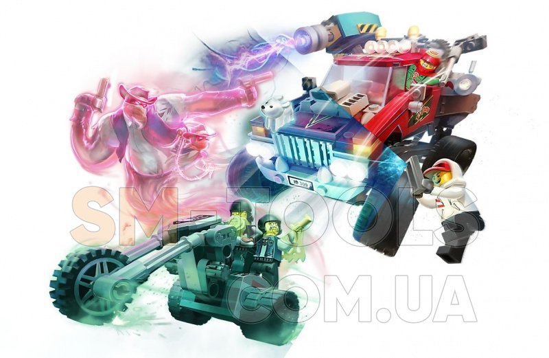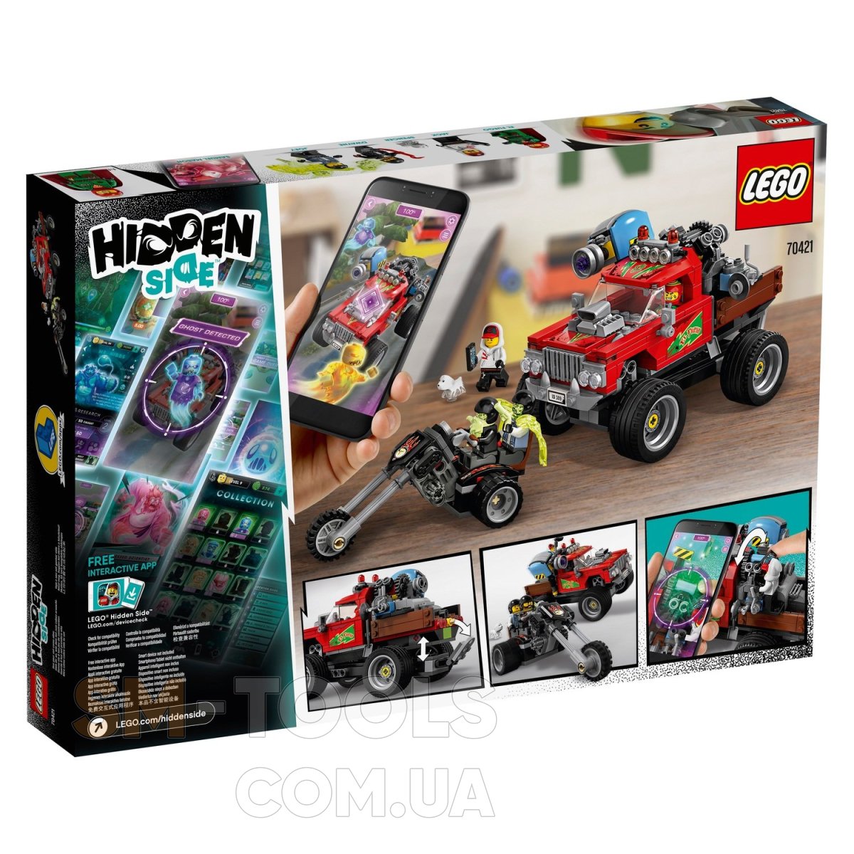 Ты готов заглянуть на Скрытую сторону? Помоги храброму Джеку Дэвидсу и его бесстрашному напарнику-каскадёру Эль-Фуэго поймать и победить двух байкеров-призраков, Джоуи и Дуэйна! Загрузи приложение LEGO® Hidden Side™ и наведи свой смартфон на Трюковый грузовик Эль-Фуэго, чтобы оживить его. Исследуй постоянно меняющуюся Скрытую сторону, разгадай новые загадки, найди крутые предметы, поймай и добавь в свою коллекцию всех привидений, а потом (конечно, если осмелишься) сразись с боссом привидений, Сэмюэлом Мэйсоном. Запрыгивай на водительское сиденье и вместе с Эль-Фуэго выполняй невероятные, захватывающие дух трюки. Придумай свои приключения в наполненном привидениями городе с этим потрясающим набором LEGO!