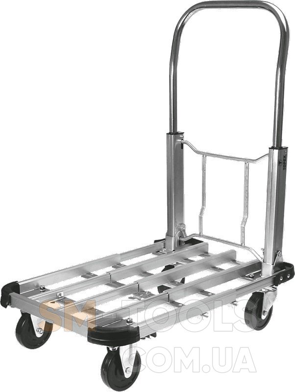 Оборудование изготовлено из высококачественного алюминия, поэтому его вес составляет всего 7,5 кг при внешних размерах 700 х 420 мм и впечатляющей грузоподъемности 150 кг. В грузовой тележке предусмотрена удобная ручка с возможностью изменения высоты в пределах от 500 до 700 мм. Со стороны ручки предусмотрена вертикальная упорная конструкция, которая предотвращает падение перемещаемых предметов в сторону человека управляющего агрегатом, обеспечивая тем самым дополнительную безопасность и комфорт. Устройство оборудовано двумя парами надежных колес с диаметром 10 см, которые обеспечивают устойчивость агрегата при погрузке и разгрузке, а также легкое перемещение в пункт назначения.