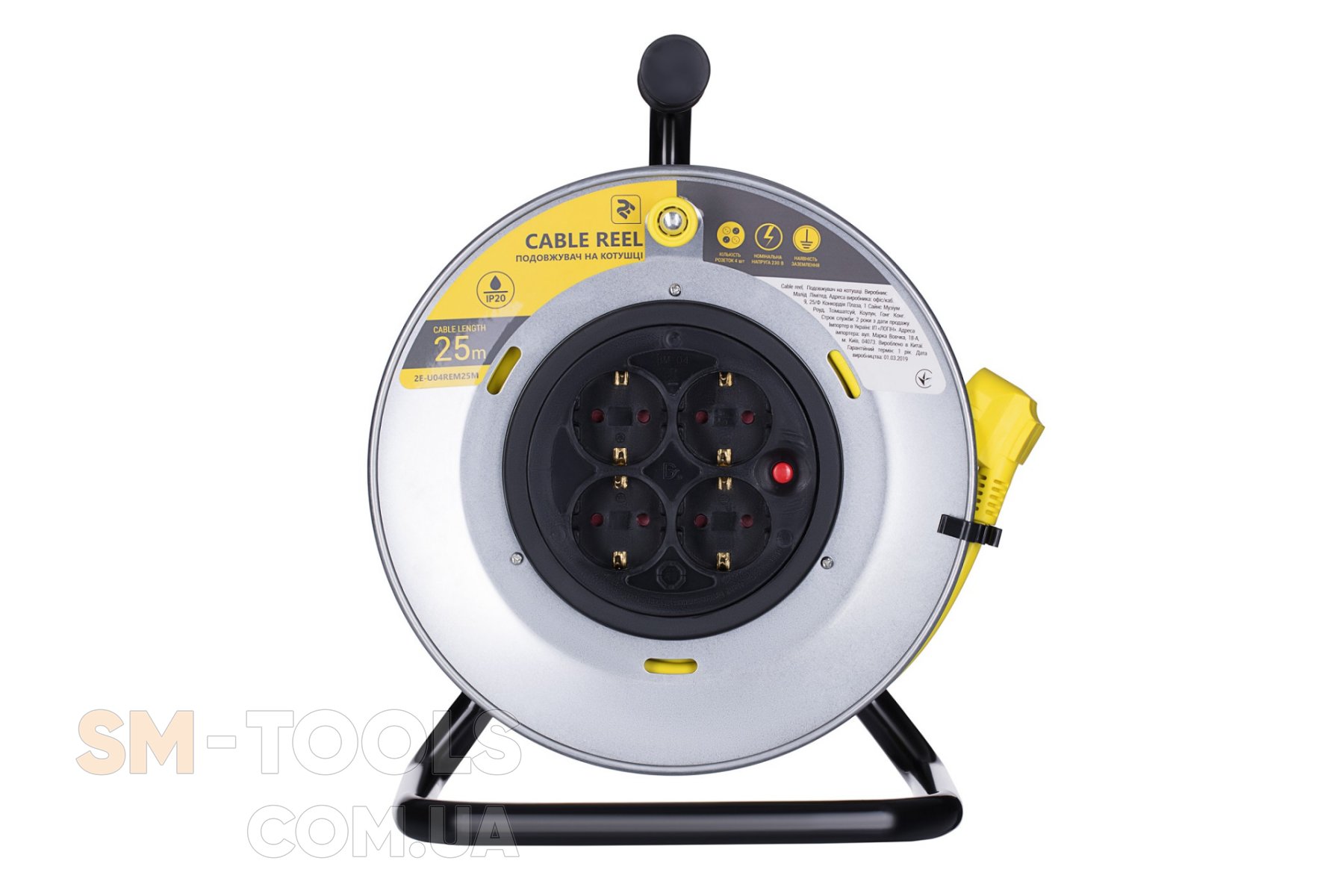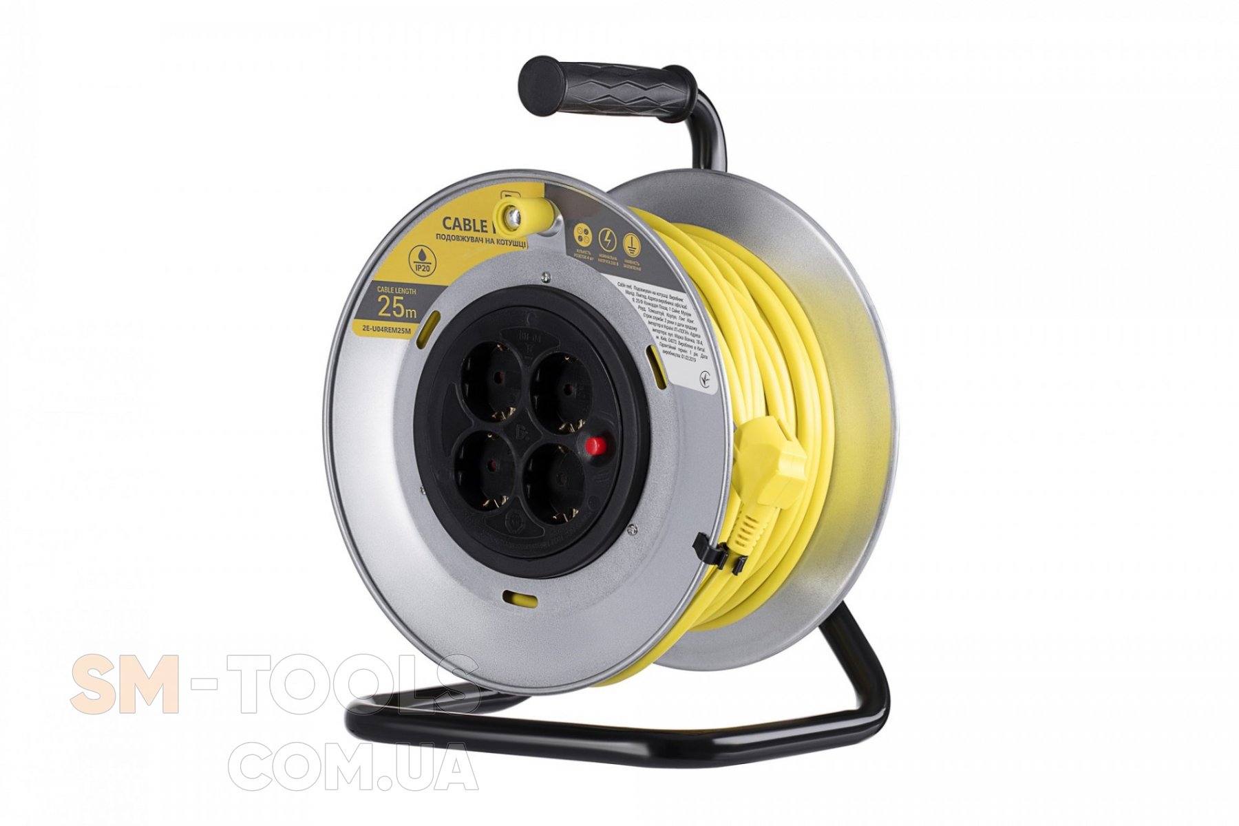 Удлинитель на катушке на 25 м с четырьмя розетками евростандарта с заземлением (Schuko), удобной ручкой и защитой IP20. Эта модель использует трехжильный кабель с сечением 1.5 мм2 (3x1.5mm). Кабель устойчив к неабразивным поверхностям, ультрафиолету и нефтепродуктам.