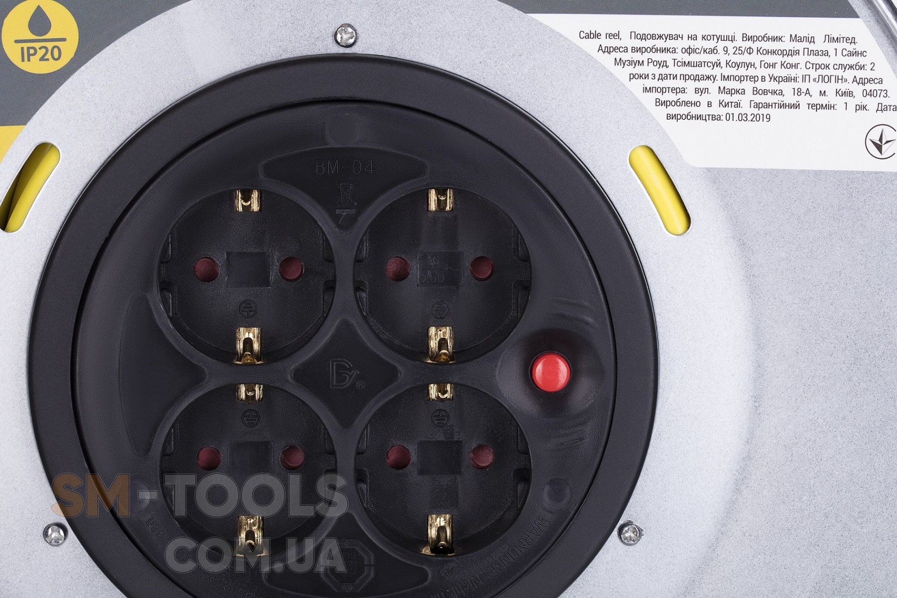 Корпус кабельной катушки изготовлен из оцинкованной нержавеющей стали и размещен на металлической раме. В центре катушки хорошо помещается блок из 4 розеток встроенный в пластиковый каркас, который выполняет роль изолятора. Если при работе нужно менее 25 м кабеля - фиксатор надежно закрепит нужную вам длину, а также он фиксирует провод при хранении. С помощью маленькой ручки сверхдлинный удлинитель легко накручивается обратно на катушку. Катушка также оснащена эргономичной ручкой для комфортной транспортировки.