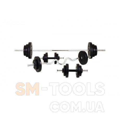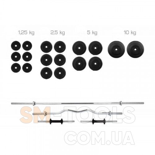 Прямой гриф для штанги и 2 гантельных грифа. Грифы изготовлено из хромированной стали (гантельные – пластик с хромированным покрытием), поэтому они чрезвычайно прочные и надежные. Обратите внимание на рифленые участки для хвата – глубокие поперечные насечки обеспечивают удобное сцепление с руками во время выполнения упражнений. Вы можете быть уверены в своем комфорте и безопасности, штанга не выскользнет из рук даже во время интенсивных тренировок.