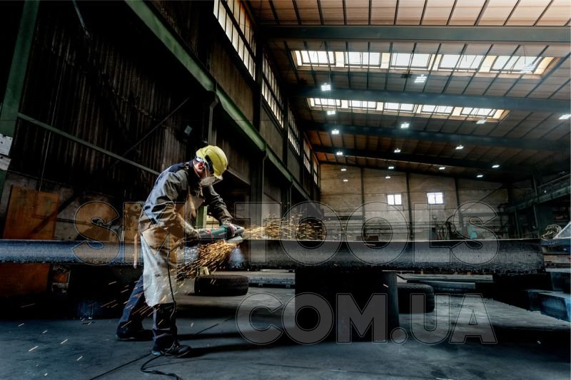 - Кнопка включения без возможности фиксации, позволяет безопасно работать на весу и защищает оператора при внезапном выскальзывании болгарки из рук.
