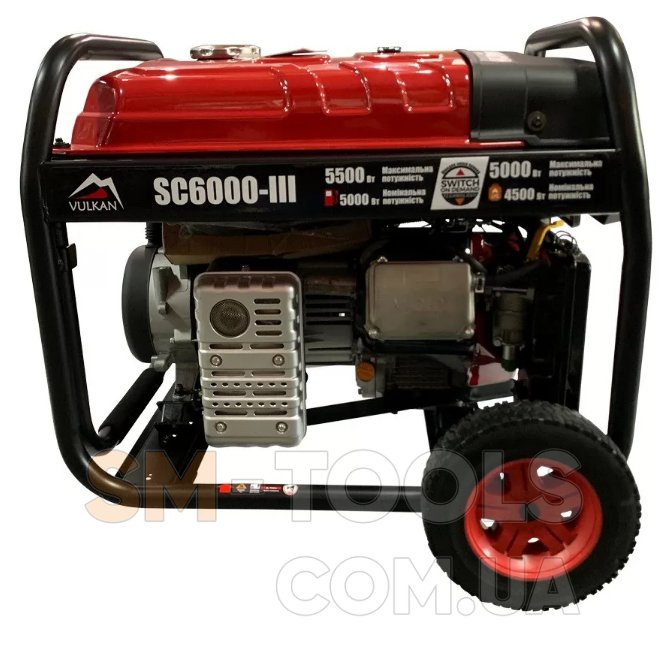Электростанция SC6000-III смонтирована на надежной металлической раме, диаметром 38 мм и потому выдерживает большие нагрузки на корпус без повреждения. Для облегчения транспортировки, генератор Vulkan в комплекте имеет пару колес диаметром 22 см.
