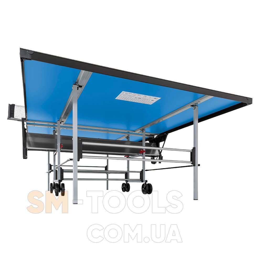 Стол оснащен 4 двойными транспортировочными поворотными колесами диаметром 125 мм, что существенно облегчает транспортировку оборудования при необходимости. В комплект также входит сетка размером 180х15,2 см и держатель для ракеток и мячей.