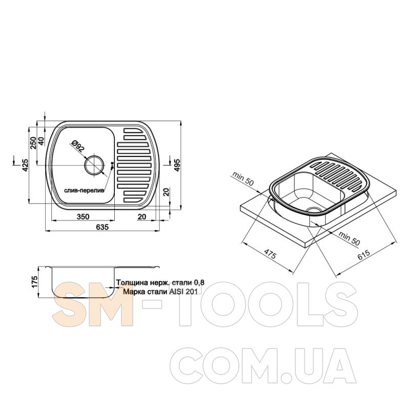Кухонная мойка Qtap 6349 Satin 0,8 мм (QT6349SAT08)