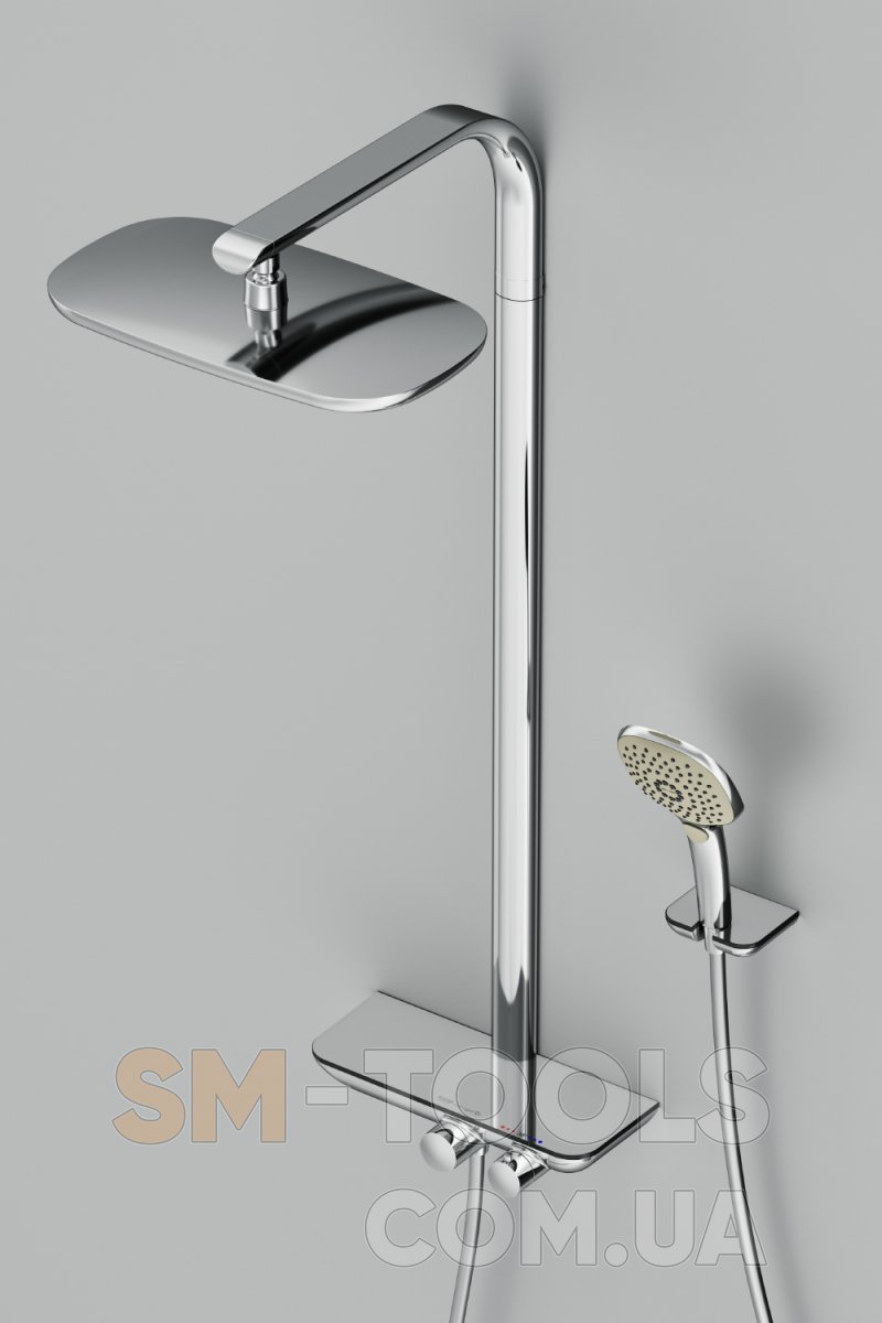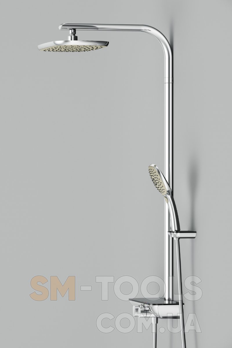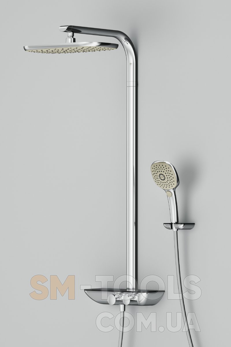 Продуманные детали для удобства использования: душевая штанга 1072 мм, душевой силиконовый шланг 1750 мм (с защитой от перекручивания), верхний душ 380*215 мм (шаровый шарнир в держателе верхнего душа, позволяющий регулировать угол наклона), ручной душ 120*120 мм (3 режима - Spray, EnerJet, Spray + Massage; переключатель режимов Simple Switch Push), настенный держатель ручного душа.
