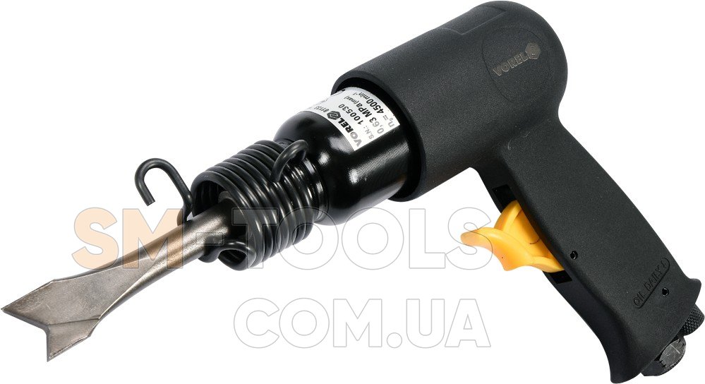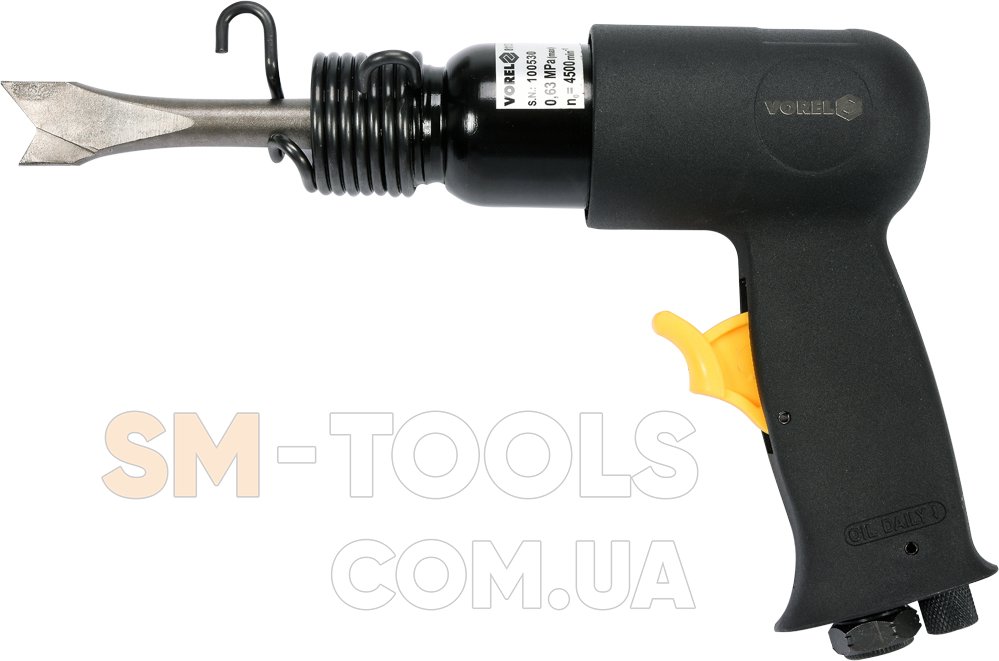 Пневматический молоток - устройство, питающееся струей сжатого воздуха под соответствующим давлением. Предназначен для разделения элементов, связанных сваркой и клепккой, резки листового металла, прошивки и профилирования. Высокая частота и сила ударов молотка обеспечивают быстрое выполнение работ. Небольшие размеры инструмента позволяют добраться до труднодоступных мест. Прочный корпус и конструкция гарантируют долговечность и устойчивость молотка. Сменные зубила позволяют адаптироватся к разным видам работы (в наборе из 3 шт.).