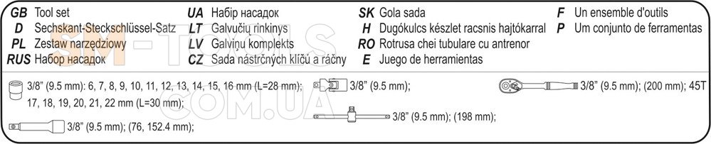 Головка торцевая 3/8": 6, 7, 8, 9, 10, 11, 12, 13, 14, 15, 16, 17, 18, 19, 20, 21, 22 мм;