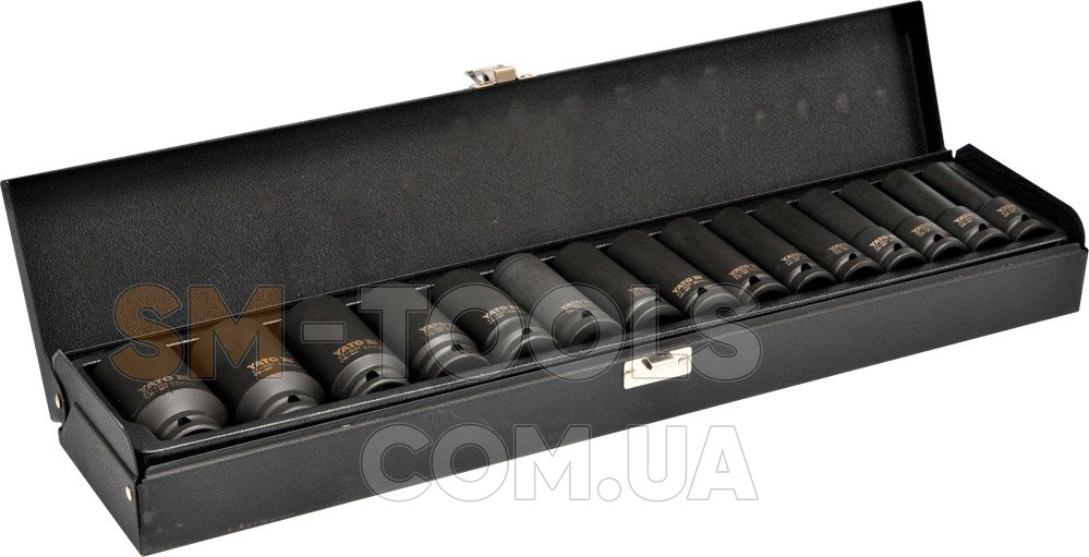 Набор ударных головок YATO предназначен для затяжки/разборки крепежа с ударом (пневматические гайковерты, ударные ключи). Инструмент выполнен из высокопрочной стали хром-молибдена CrMo SCM-440. Молибден увеличивает прочность стали. В комплекте: металлический кейс и 15 насадок 1/2": 10, 12, 13, 14, 15, 16, 17, 18, 19, 21, 22, 24, 27, 30, 32 мм длинной 78 мм.