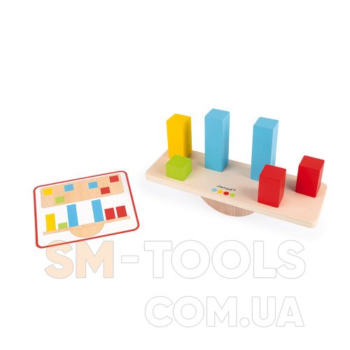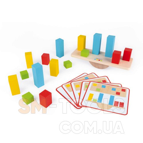 Дерев'яний балансир-головоломка з інструкціями. Дитина повинна скласти кольорові кубики відповідно до інструкції. Однак це потрібно зробити в правильному порядку, щоб балансир не дуже сильно відхилявся в одну сторону і не торкався робочої поверхні, на якій розташована іграшка. Таким чином, діти можуть з'ясувати, що важче, а що легше. Відмінна вправа, яка розважає та розвиває у дитини навички ручної праці, спостереження, вивчення кольорів та ваги. Крім того, вона вчить терпінню і просторового сприйняття, що дуже важливо для дітей в цьому віці. Іграшка містить 5 двосторонніх інструкцій, дерев'яний балансир, 16 кольорових кубиків і прямокутників різних розмірів. Рекомендований вік: 3+. Розмір: 23 х 8 х 5,5 см.