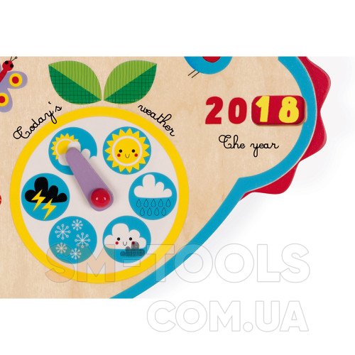 Це чудова інтерактивна забавка у навчальний клас або дитячу кімнату. Іграшку можна повісити на стіну; дітям буде зручно позначати, який сьогодні день, місяць, пора року і навіть погода.