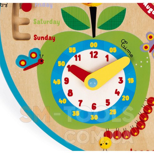 Розвивальна іграшка 2 в 1: календар і годинник. Навчальний набір допоможе дітям дізнатися багато нового про довкілля, зміну пір року. З допомогою іграшки діти зможуть вивчити назви днів, сезонів, навчитись визначати час за годинником. Іграшка дерев’яна, виготовлена з безпечного сертифікованого матеріалу, покрита нетоксичними фарбами на водній основі. Рекомендований вік: 3+. Розмір годинника: 37.5 x 2.7 x 41.7 см.