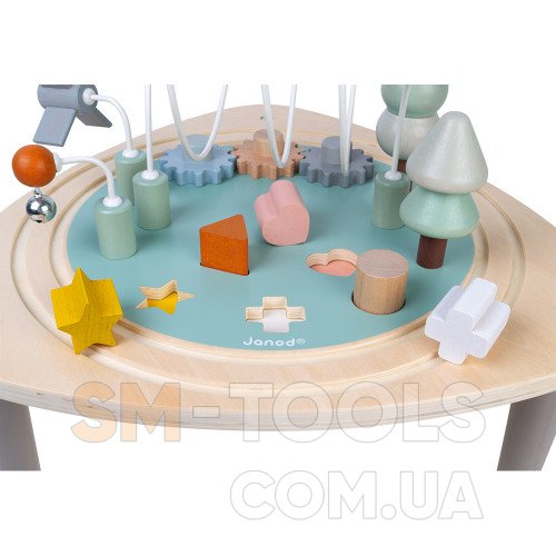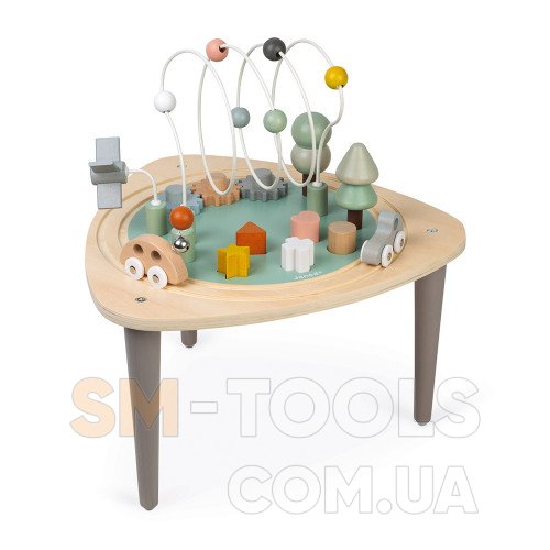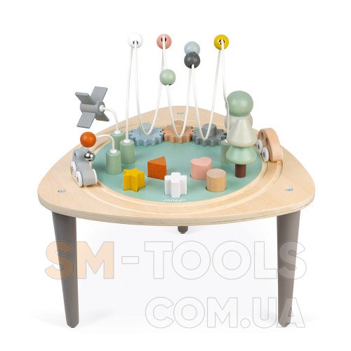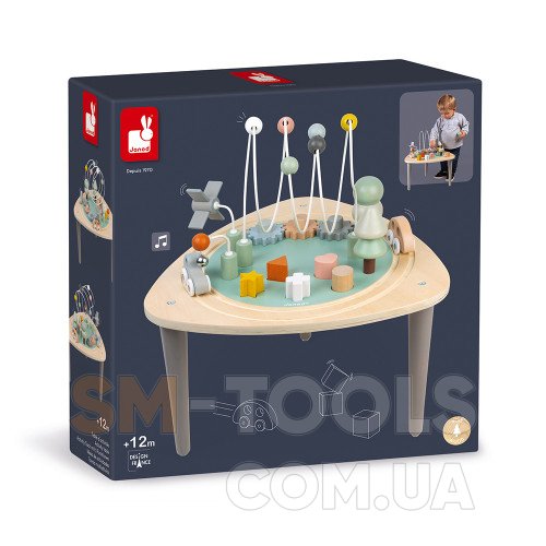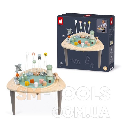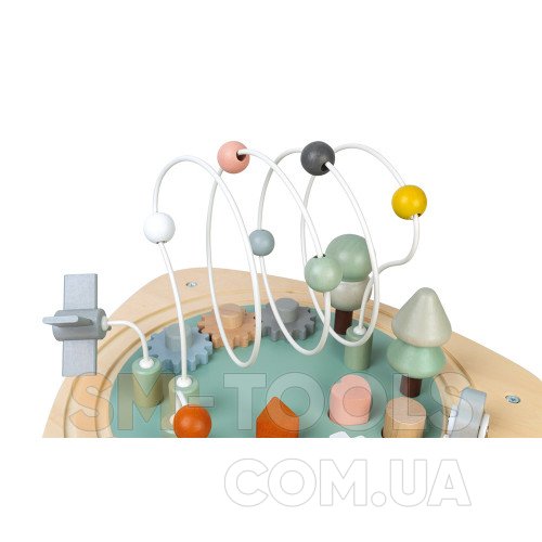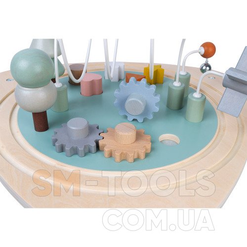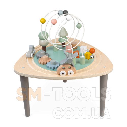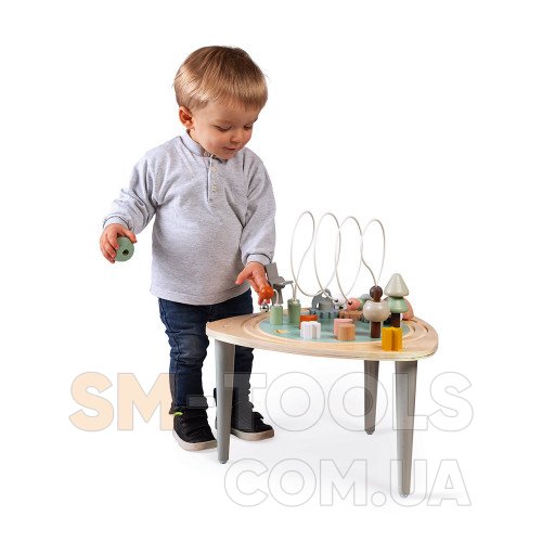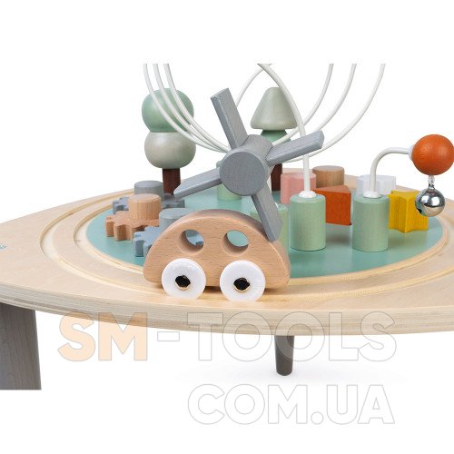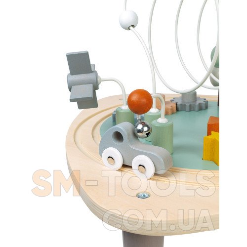 Цей багатофункціональний деревяний стіл ідеально підходить для малюків! Малюк зможе доторкнутися до всього і вчитися, розважаючись у всіх цих маленьких іграх: круговий потяг з 3 машинами, 2 дерева для збірки, 3 петлі з кулями, млин і маленький дзвіночок, 3 шестерні для обертання і 5 формочок. Цей багатофункціональний стіл оснащений нековзними ніжками для більшої стійкості. Висота столу 26,5 см. Ця дерев'яна іграшка - частина колекції Sweet Cocoon, ніжною колірної гами, натхненної сучасними тенденціями, яка ніжно супроводжує перші уроки вашої дитини!