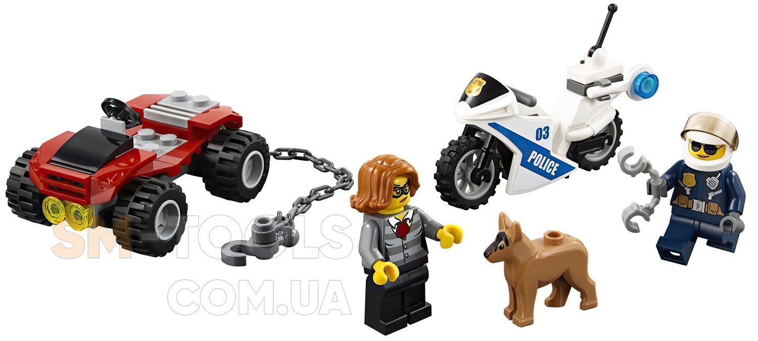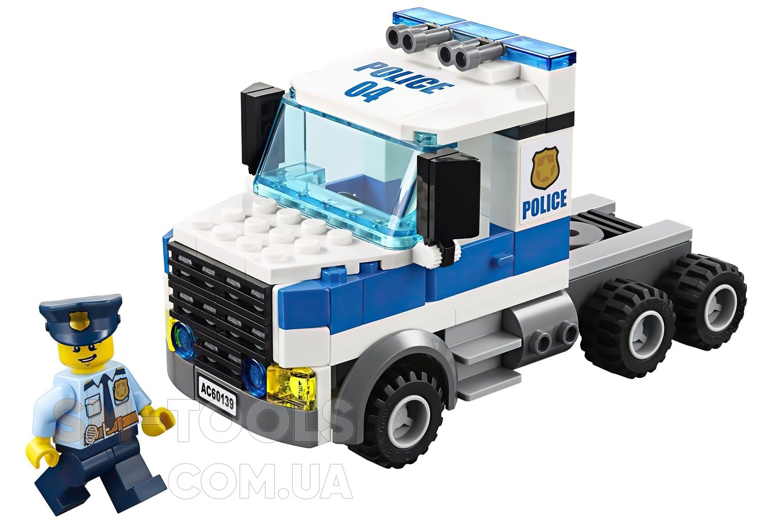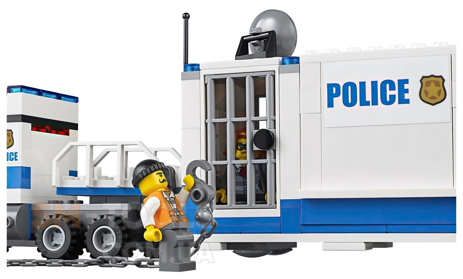 Зупини вантажівка і випусти поліцейську собаку! Спільник допомагає злодюжку втекти з пересувної в'язниці. Прикріпи гак з ланцюгом від всюдихода до дверей в'язниці і тисни на газ, щоб висадити двері. Спусти вниз задній пандус Мобільного командного центру та вивантажити поліцейський мотоцикл, а потім догони злодюжок і поверни їх у в'язницю!
