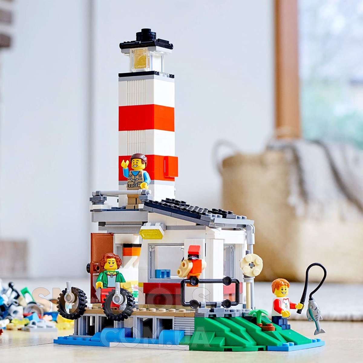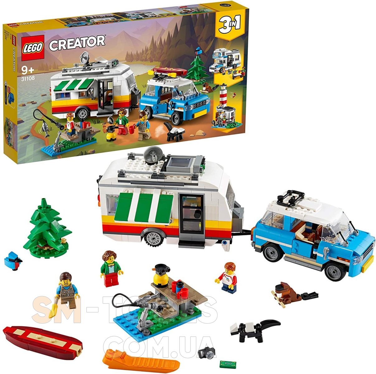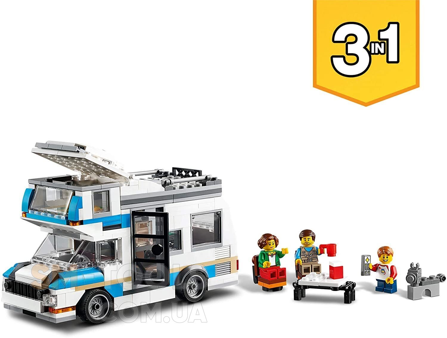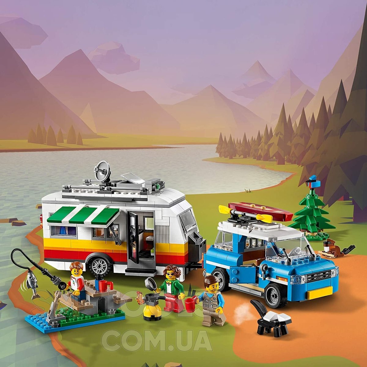 Пакуй рюкзаки! Настав час вирушити у відпустку! Прикріпи будинок на колесах до крутого ретромобілів і вирушай на природу на вихідні. Знайди відповідне місце, розбий табір і злови трохи риби на вечерю. Ой, подивися на цього милого звір ... о, ні, це ж СКУНС! Коли цей смердючий кошмар закінчиться, перебудови будинок на колесах і автомобіль в фургон або червоно-білий маяк. Вихідні на природі – не проблема з цим набором 3 в 1!