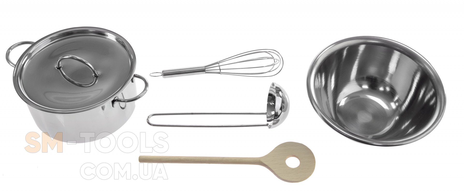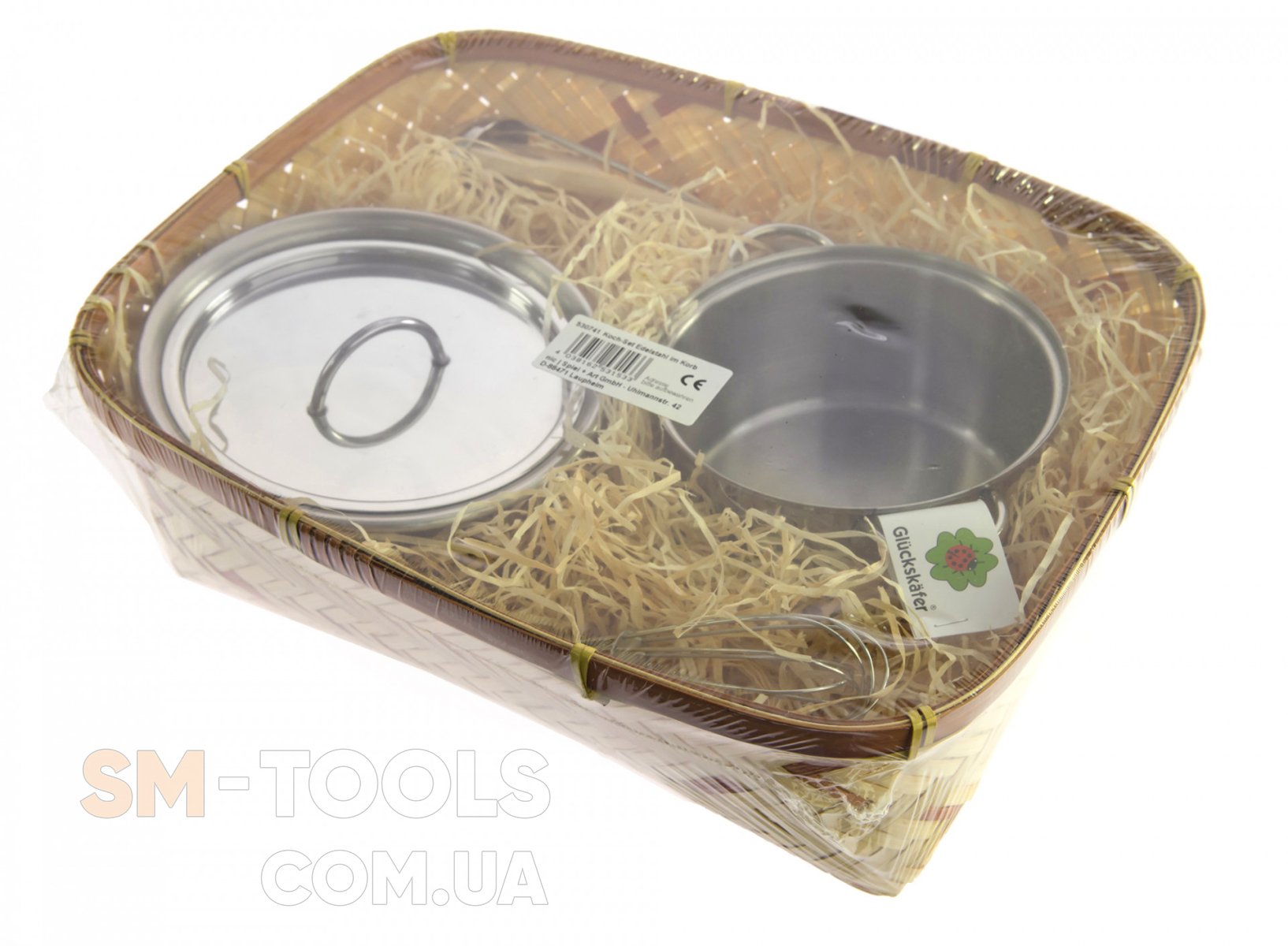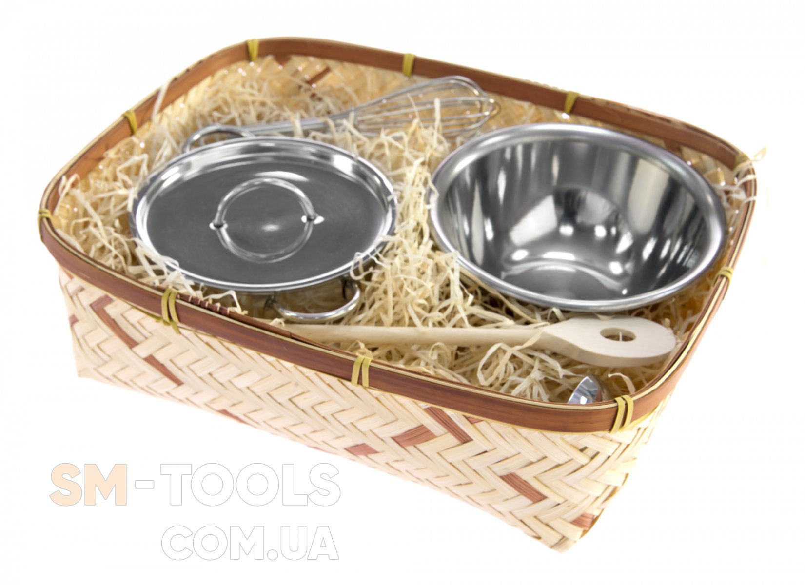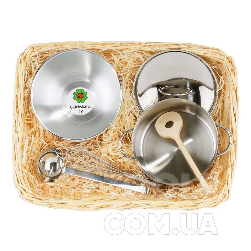 Набор игрушечной посуды немецкого производителя игрушек nic – это 5 предметов кухонных принадлежностей для маленьких поваров. Все предметы выполнены из металла и выглядят совсем как «взрослые»! Кастрюли среднего размера, потому подойдут почти для любой детской кухни. Игрушечная посуда поставляется в плетеной корзине, которая прекрасно подходит для хранения игрушек. Набор посуды для детей от 3-х лет.