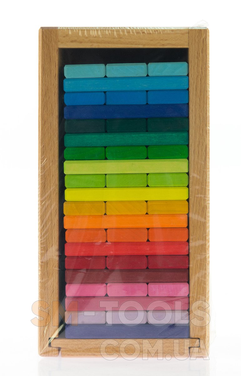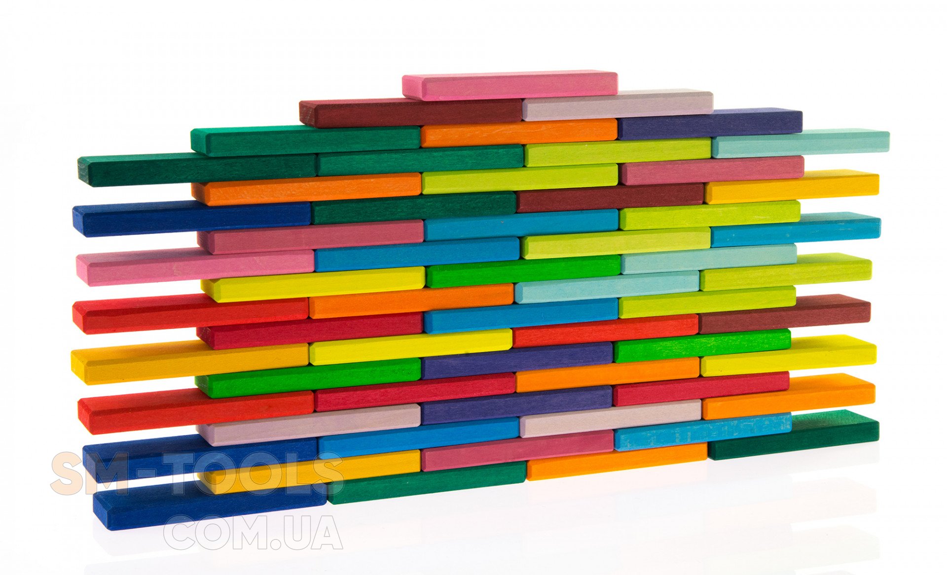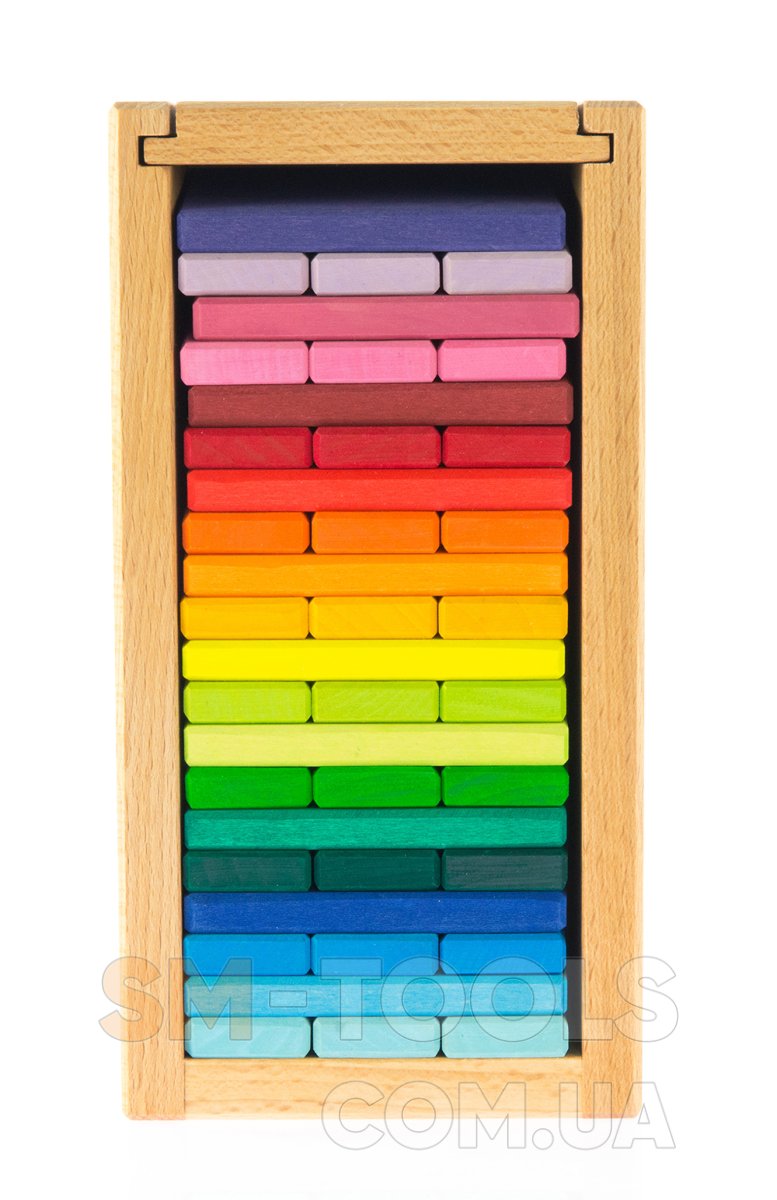 Весь спектр райдуги в руках дитини навчить її розрізняти не тільки кольори, а і їх відтінки. А за допомогою класичних будівельних блоків однакових розмірів можна майструвати різноманітні вежі, конструкції, райдугу або все те, що побажає дитина. Також цей набір можна використати у якості всесвітньовідомої гри «Дженга».
