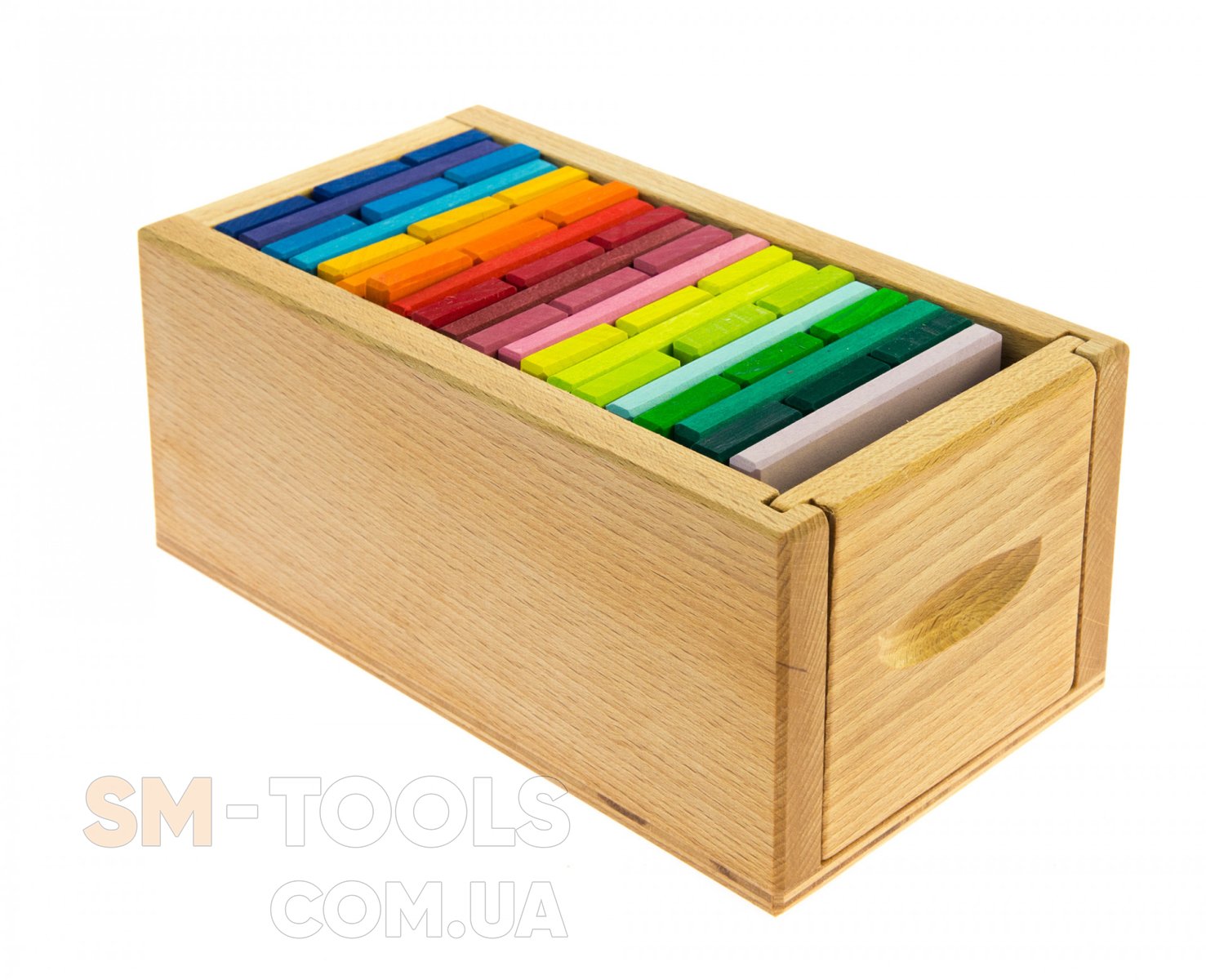 Райдужний набір дерев’яних будівельних пластин «Вежа» німецького виробника іграшок nic - це необмежений світ творчості для дитини. Елементи конструктора складені у надійному дерев’яному ящику, а весь набір стягнутий прозорою поліетиленовою плівкою. Одна з сторін ящика відсутня, тож можна повністю бачити кольорову райдугу з дерев’яних пластин у розрізі. Верхня кришка ящика має виїмку і зручно висувається. Усі елементи вироблені із натуральної деревини, вони вкриті тонким шаром безпечних фарб на водній основі. Розміри набору: 24х12,5х9,5 см. Дрібні деталі відсутні, тому конструктор підходить дітям від 1 року.