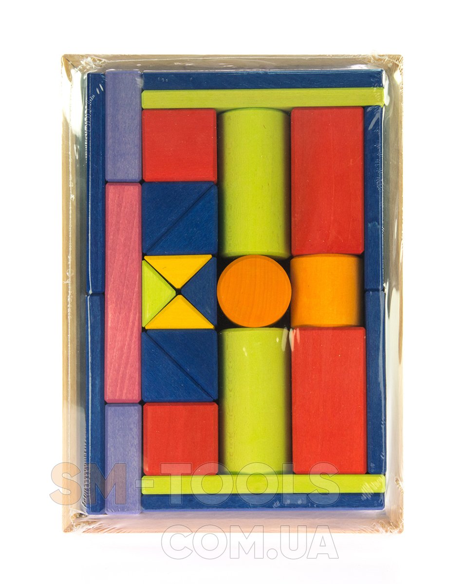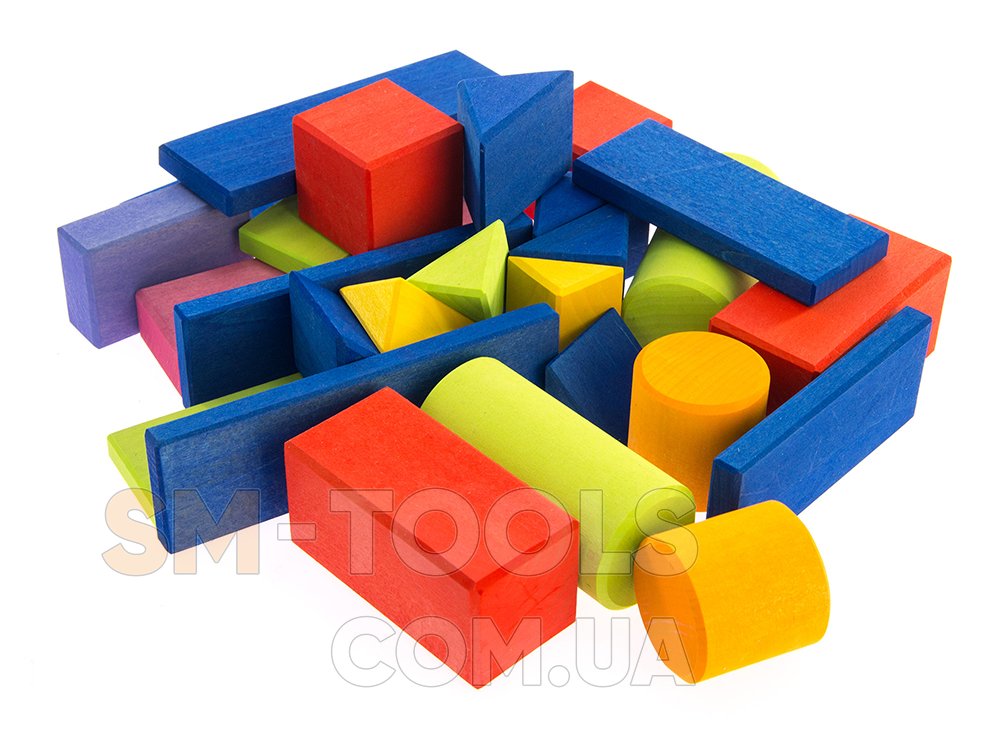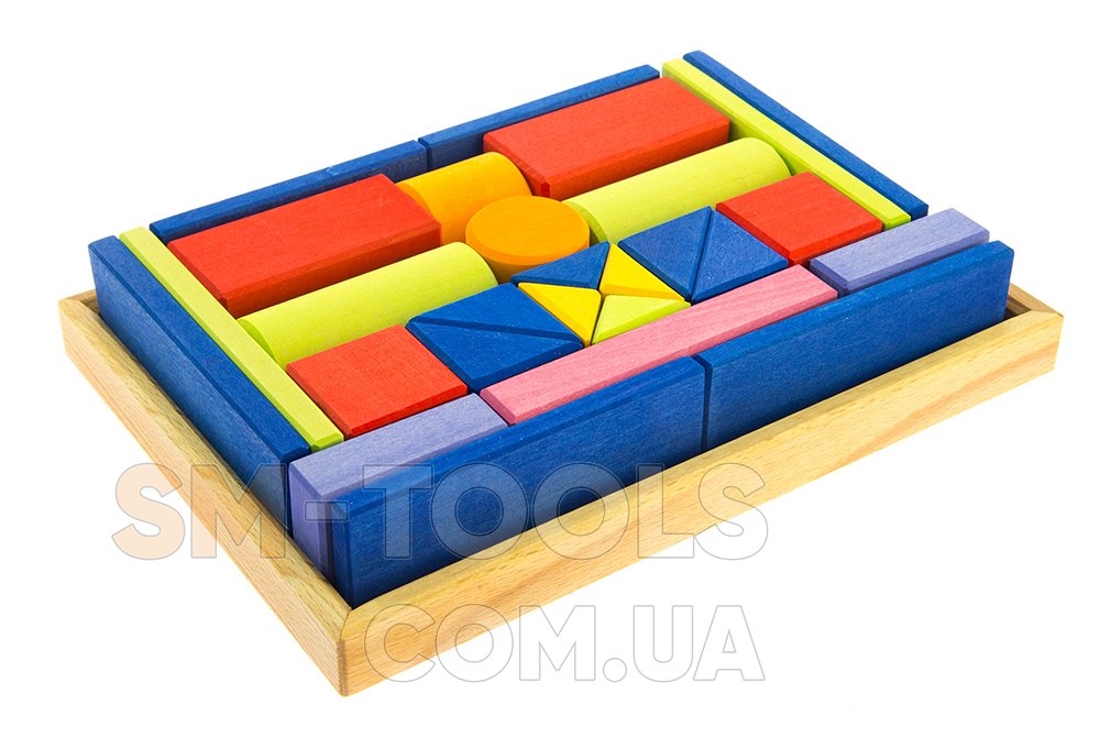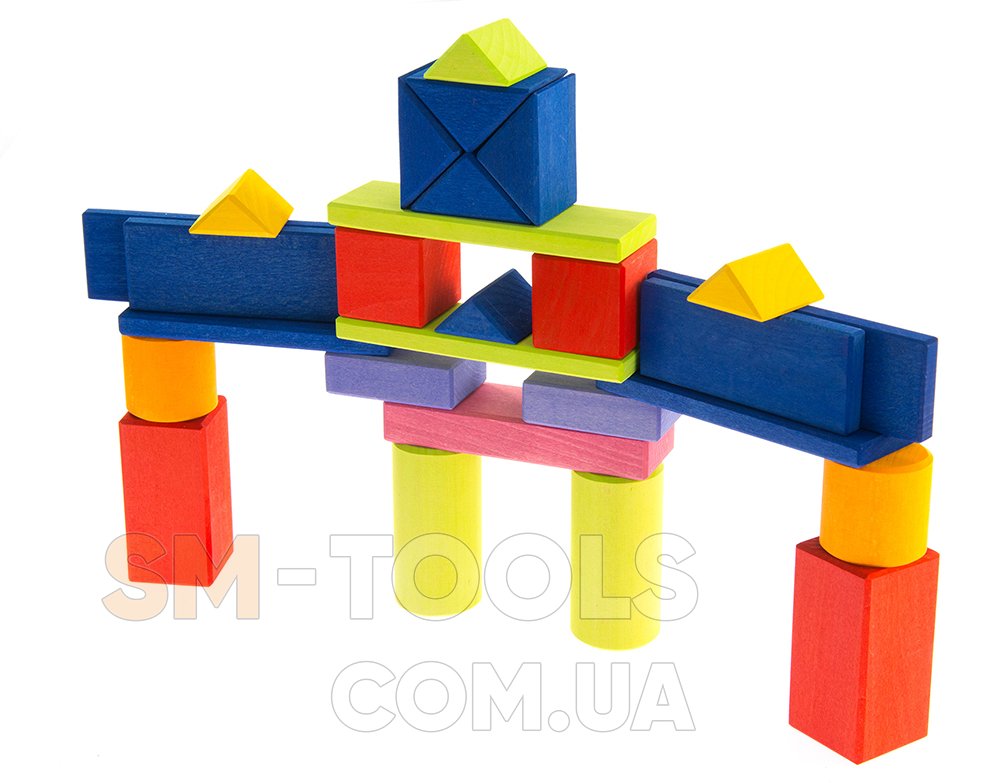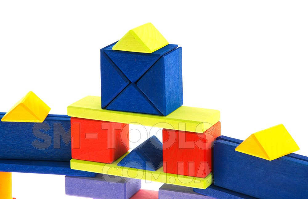 Среди геометрических фигур конструктора ребенок обнаружит элементы следующих форм: прямоугольной, квадратной, треугольной, а также цилиндры. Благодаря им малыши будут строить конструкции, мосты, башню. Они научатся различать формы, вес деталей.