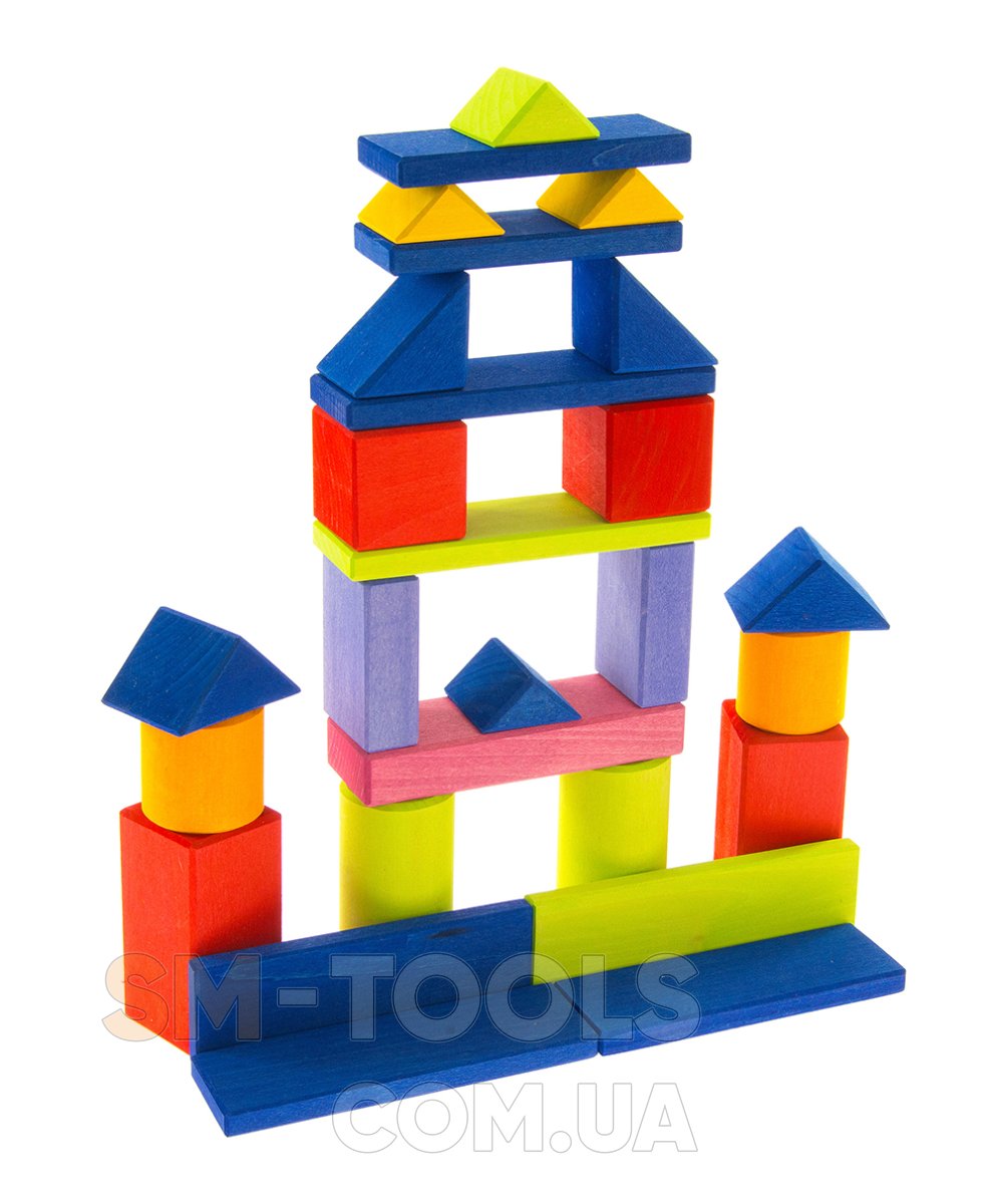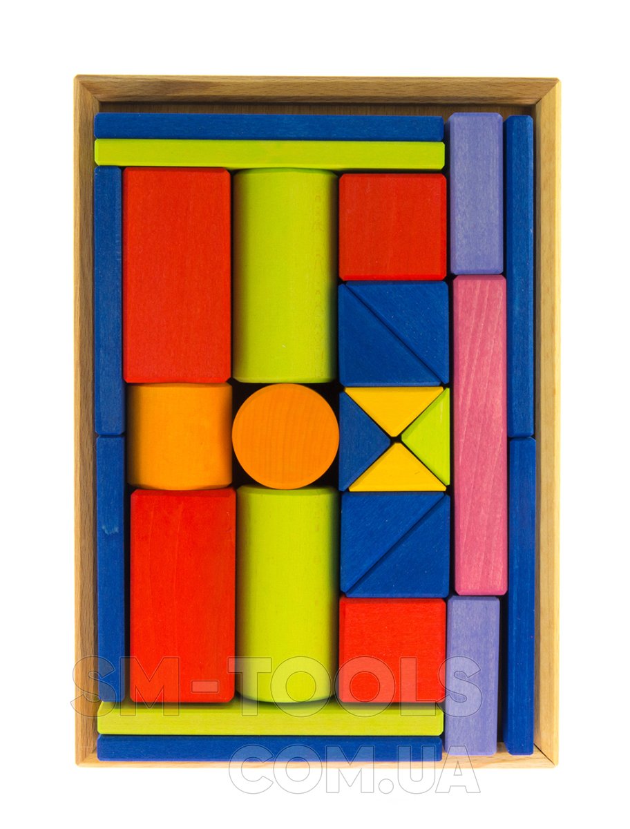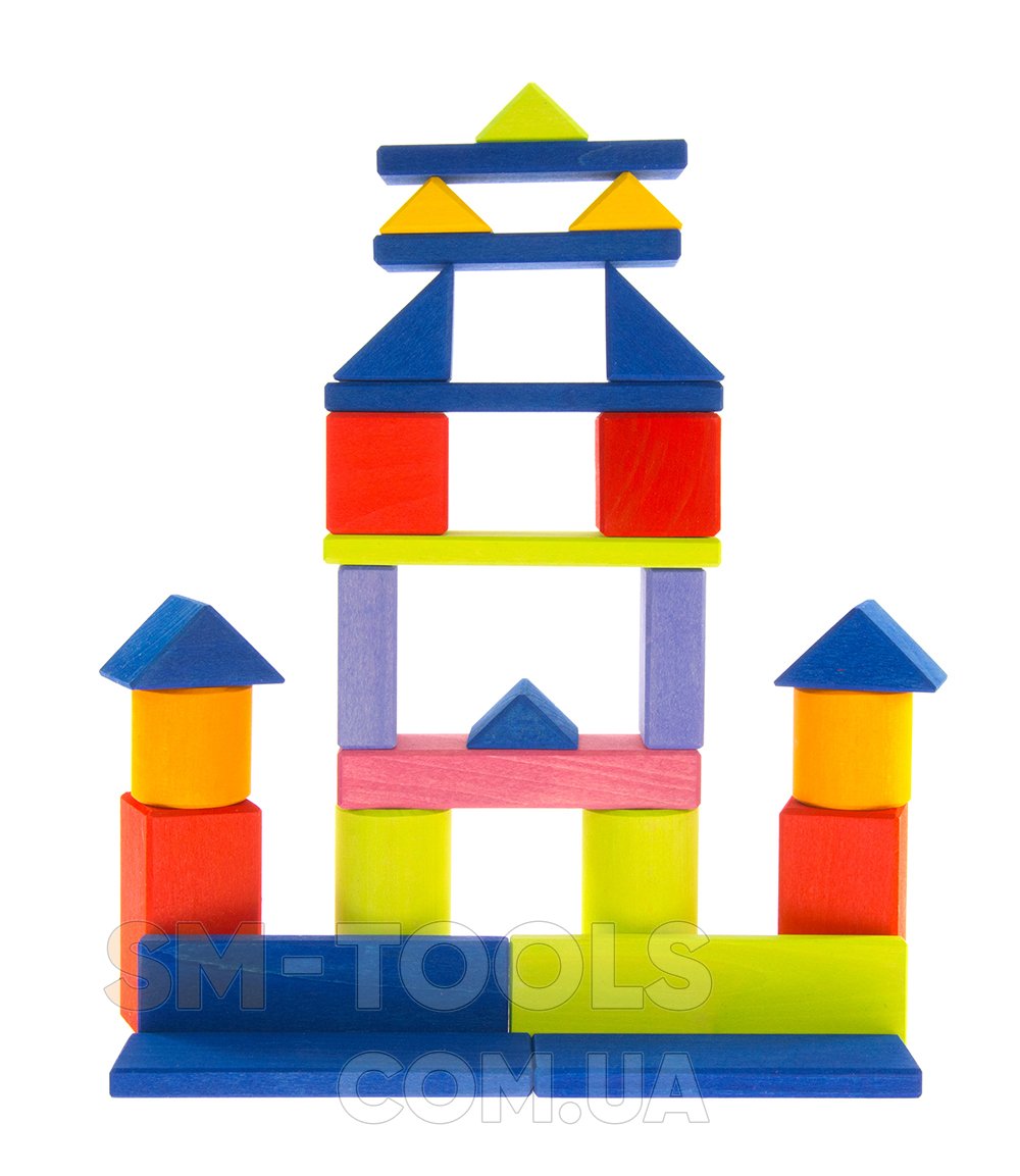 Среди геометрических фигур конструктора ребенок обнаружит элементы следующих форм: прямоугольной, квадратной, треугольной, а также цилиндры. Благодаря им малыши будут строить конструкции, мосты, башню. Они научатся различать формы, вес деталей.